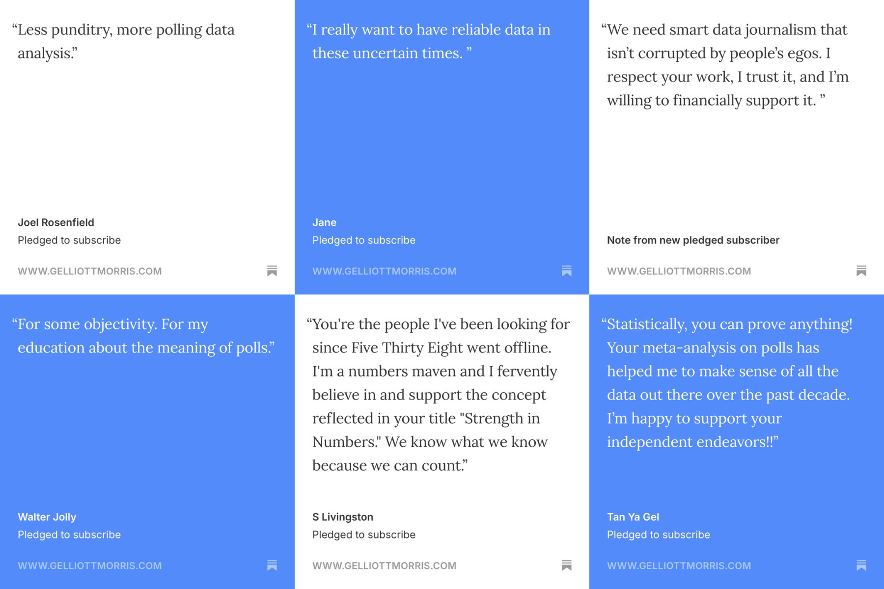 Pricing: A premium subscription is $10/month or $90/year. I think this is a reasonable price, given the frequency, quality, and uniqueness of output here. Frankly, nowhere else in media are you going to find this coverage of data in politics and elections that is so comprehensive, deep, original, and innovative. As a benchmark, generally, Strength In Numbers is far cheaper than competitor data-driven sites that offer less hard data and fewer articles (some political intelligence websites are $350 a year!).