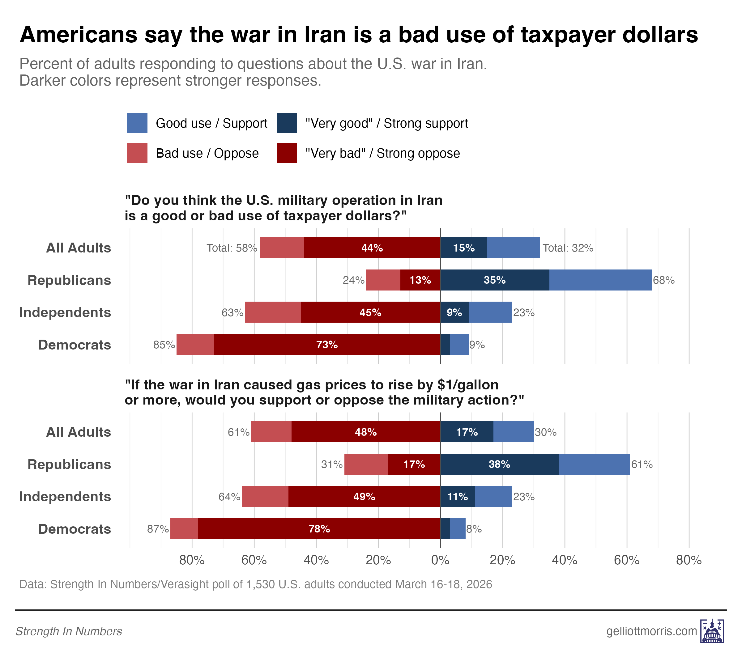 Given the price tag above, many even pro-Trump Americans are now asking if the war is worth the cost. According to our new March Strength In Numbers/Verasight poll (fielded March 16-18, 2026 among 1,530 U.S. adults), a majority of Americans say it’s not. In this special Friday Chart of the Week, I give a sneak peek at next week’s poll release: Voters say the war in Iran is a bad use of taxpayer dollars.