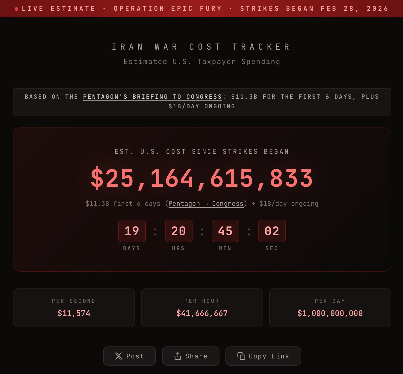 It’s not just gas prices. Today, a reader emailed me a link to a website that estimates the total military cost of the war in real time and puts the price tag at roughly $25 billion in 20 days. (I did a quick Google and found no fewer than five of these sites; my theory is that people are using AI to spin them up quickly. Each site has different numbers, but this one extrapolates from the Pentagon’s briefing to Congress.)