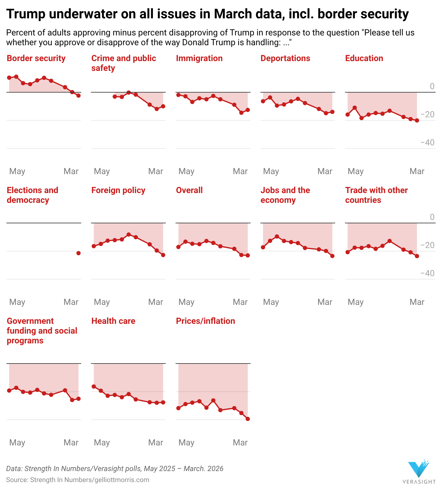 How can Trump be under water on border security? Interactions on the border are drastically lower than in the Biden years and the news media (presumably FOX included) isn't reporting/showing waves of migrants flooding the US. Could it be that once a politician goes "south" on a few key issues (economy and war) then all the issues begin to flip?