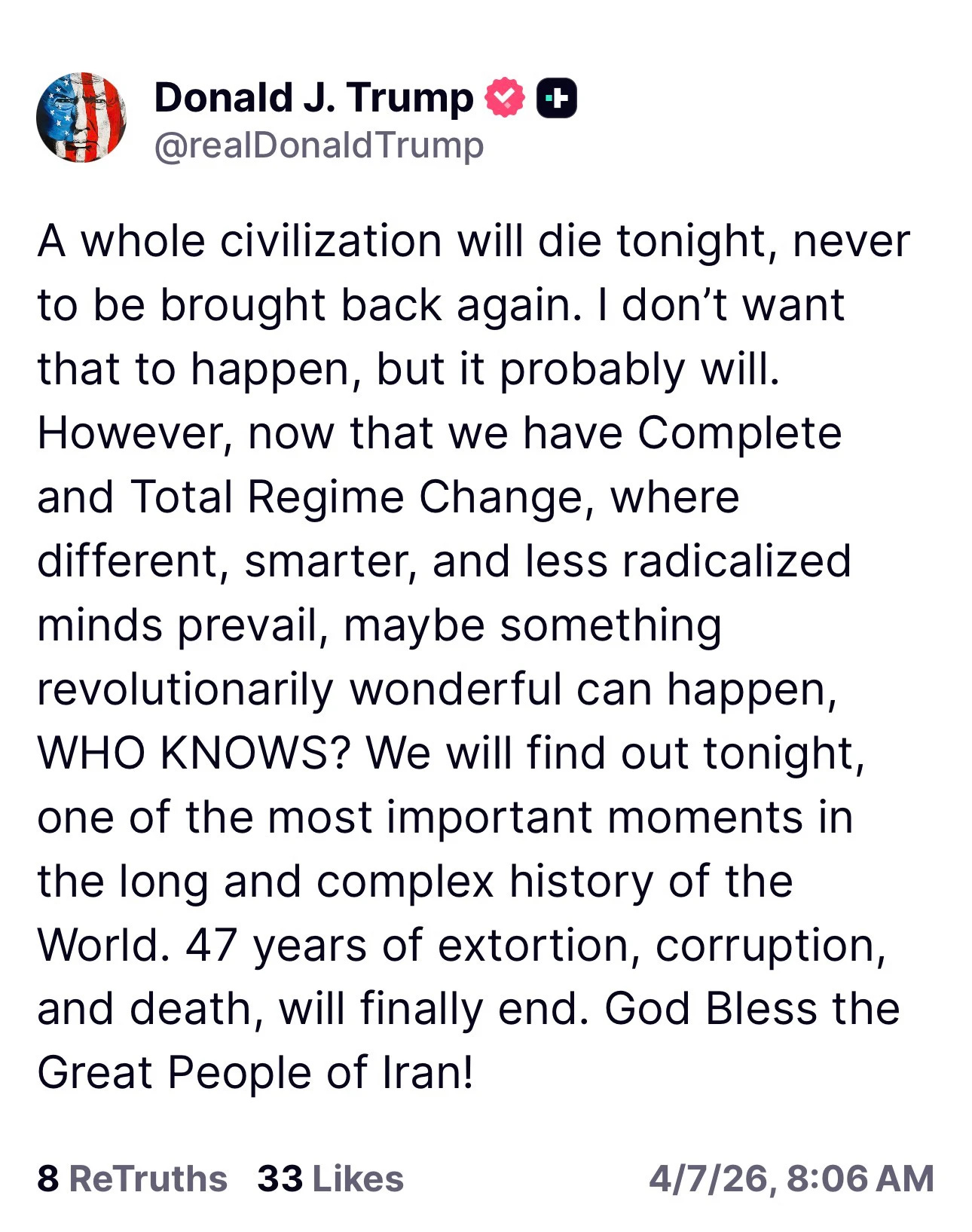 On Tuesday morning, April 7, 2026, President Donald Trump posted on Truth Social: “A whole civilization will die tonight.” Trump gave Iran until 8 p.m. Tuesday to reopen the Strait of Hormuz or face the “complete demolition” of every bridge and power plant in the country. On Easter morning, he posted “Open the F---in’ Strait, you crazy b-----ds, or you’ll be living in Hell! Praise be to Allah.” At publication, it is still unclear what form the threatened use of force would take.