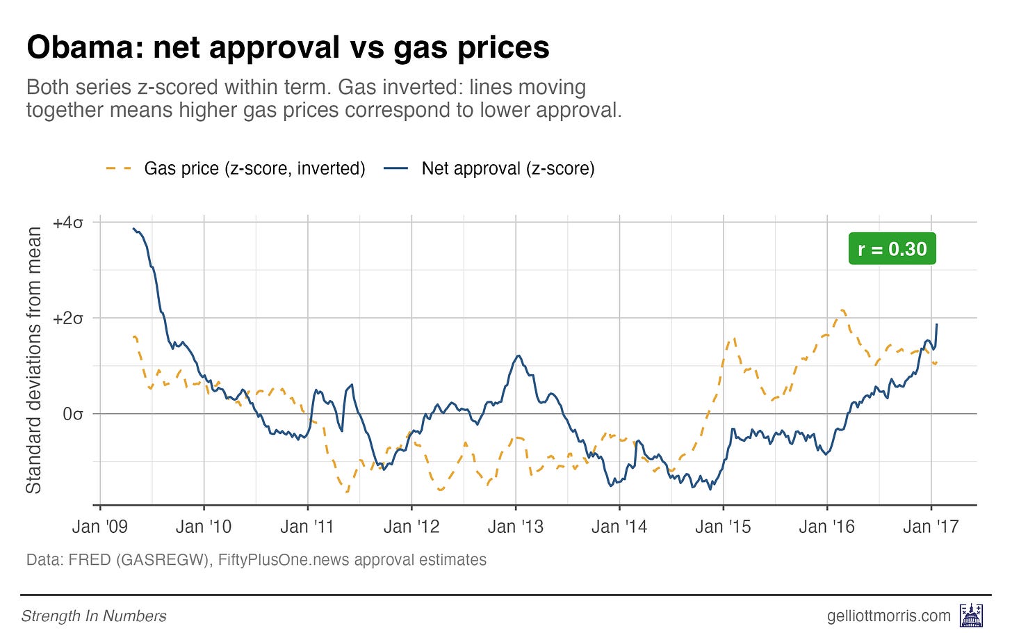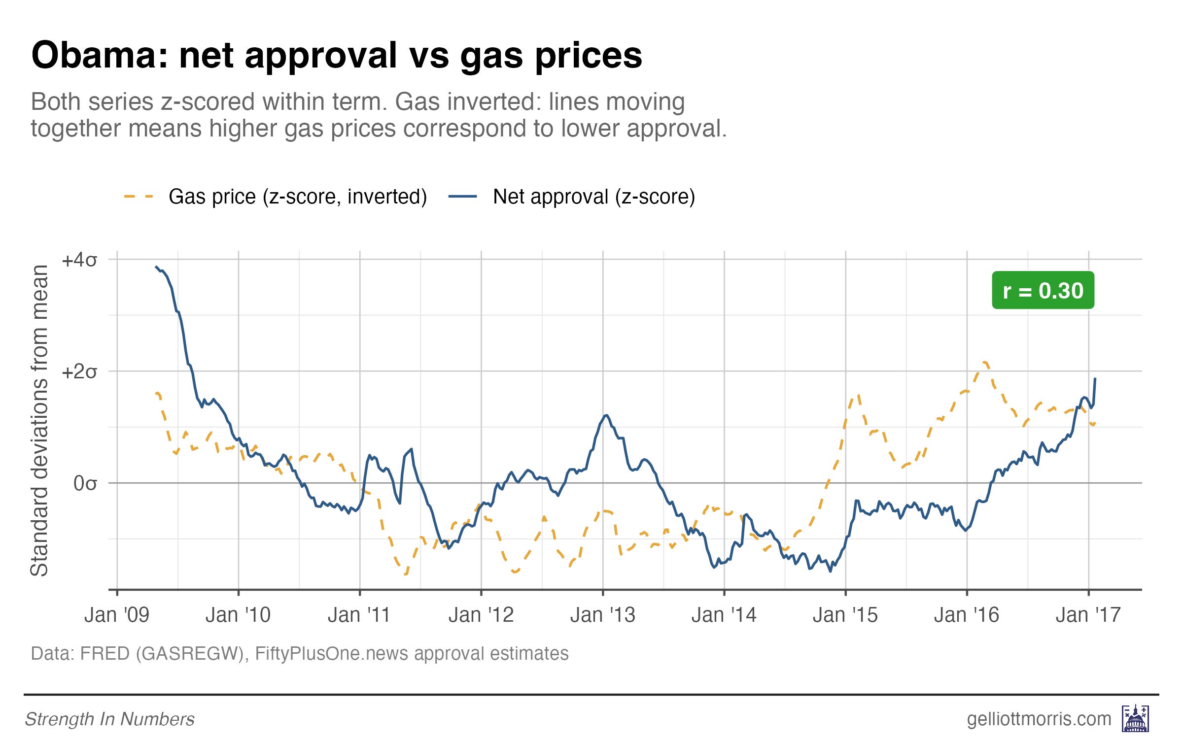 But this brings up the secondary question of how strong the historical relationship between gas prices and presidential approval is in the first place. So I pulled weekly gas price data from the St. Louis Fed and daily presidential approval estimates from our data at 50+1 going back to 2009 to find out. This week’s Chart of the Week is: a data-heavy look at the gas price–approval connection across four presidencies. Even if we don’t learn anything concrete, I think these are some fun graphs I haven’t seen elsewhere.