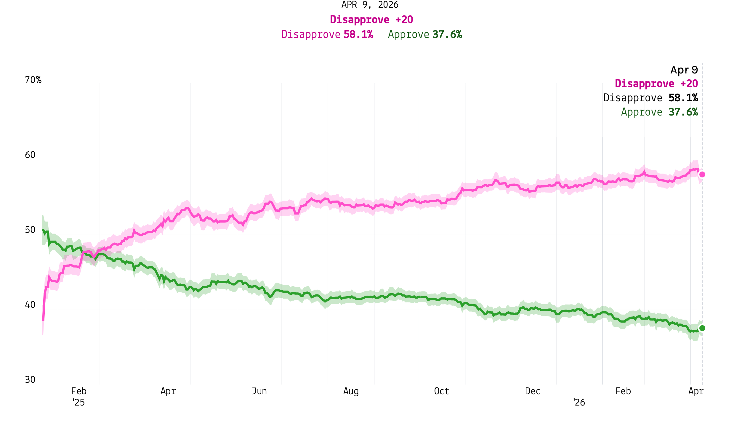 Trump’s approval rating in term two has mostly been driven by tariffs, backlash to his deportations policy, the Epstein controversy, the war in Iran, and a general sense that he’s not focused on the issues voters care about. Cheap gas would certainly not hurt his ability to win back voters, but it’s not going to reverse a 20-point net negative approval rating that has been falling for over a year straight.