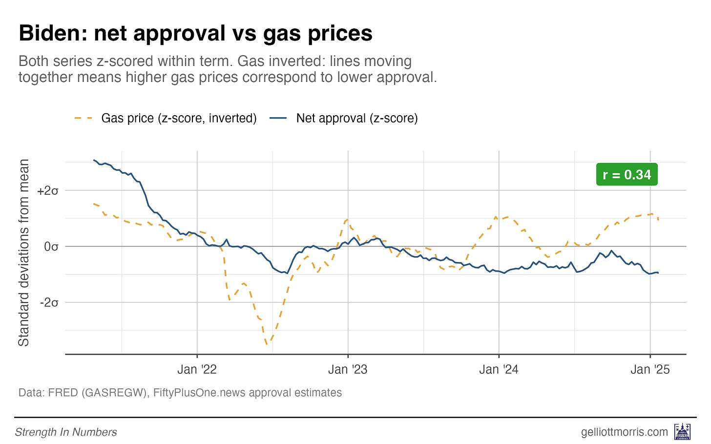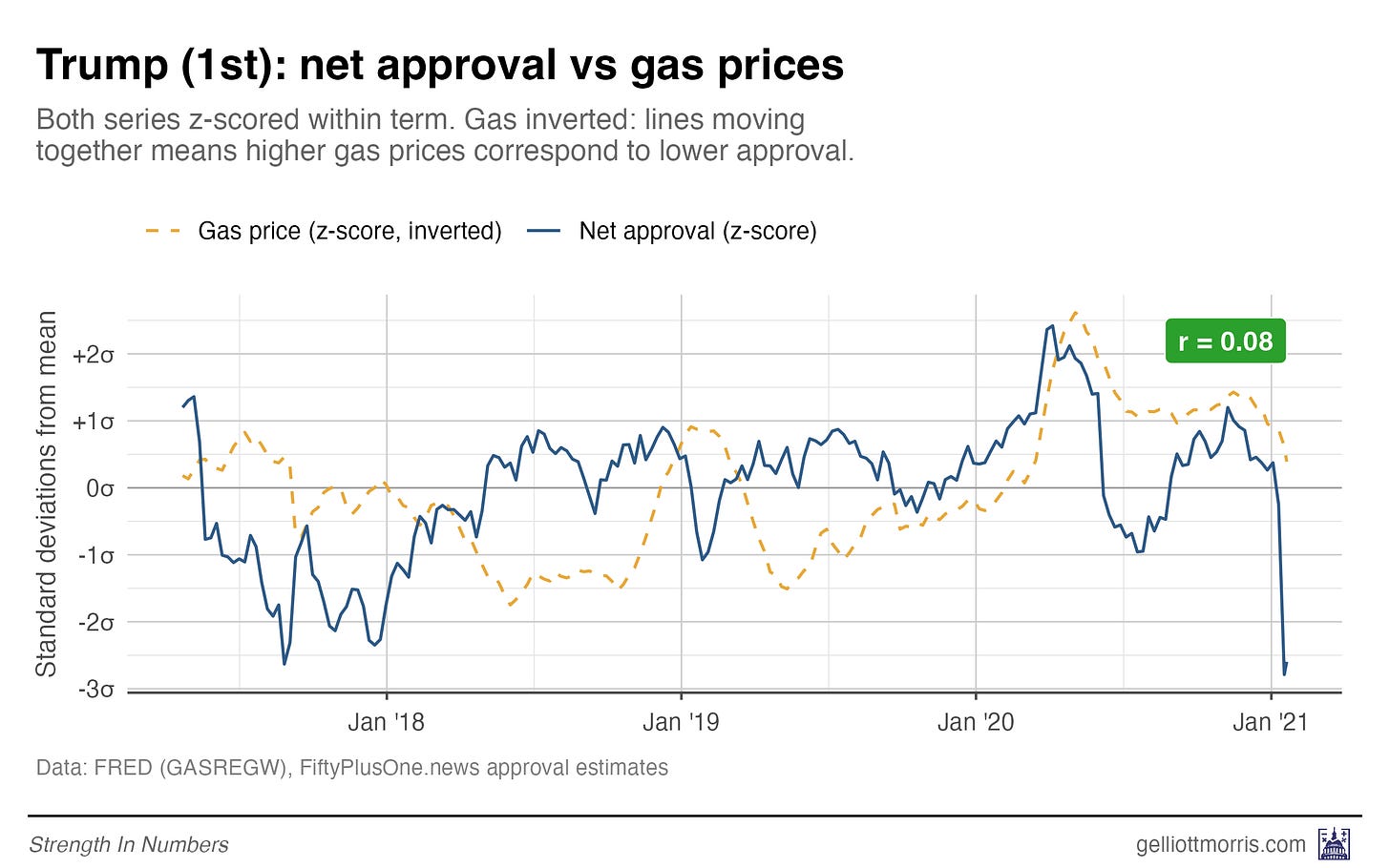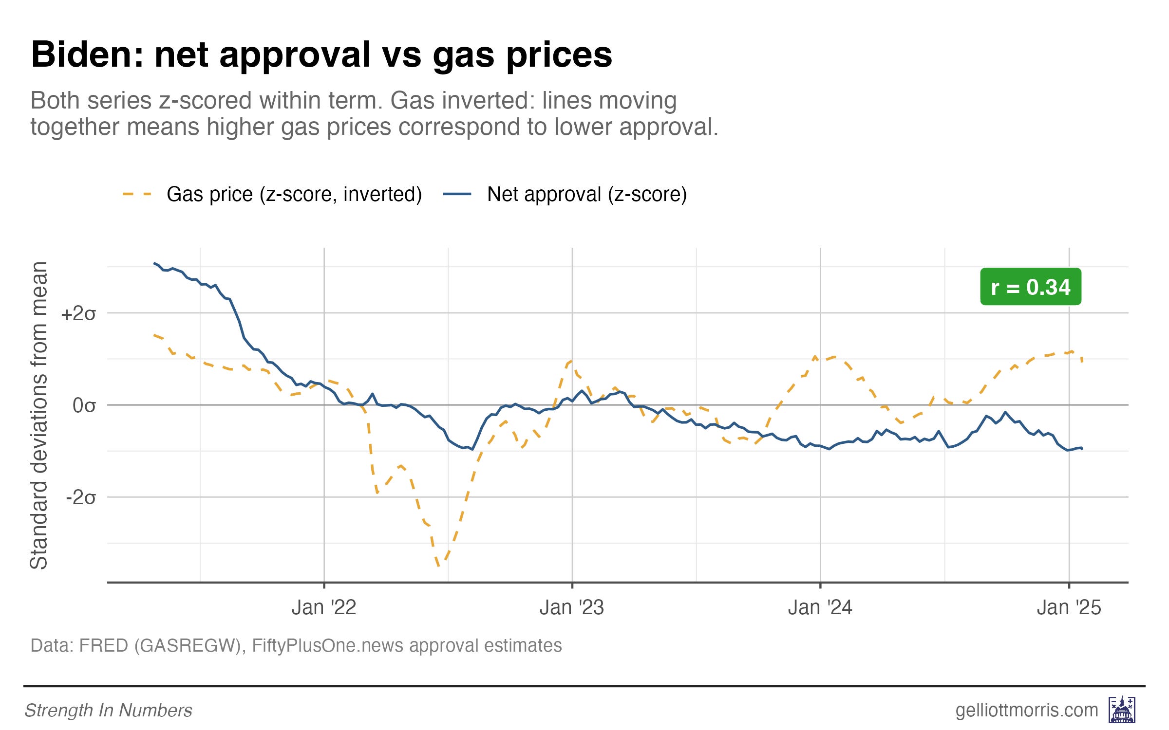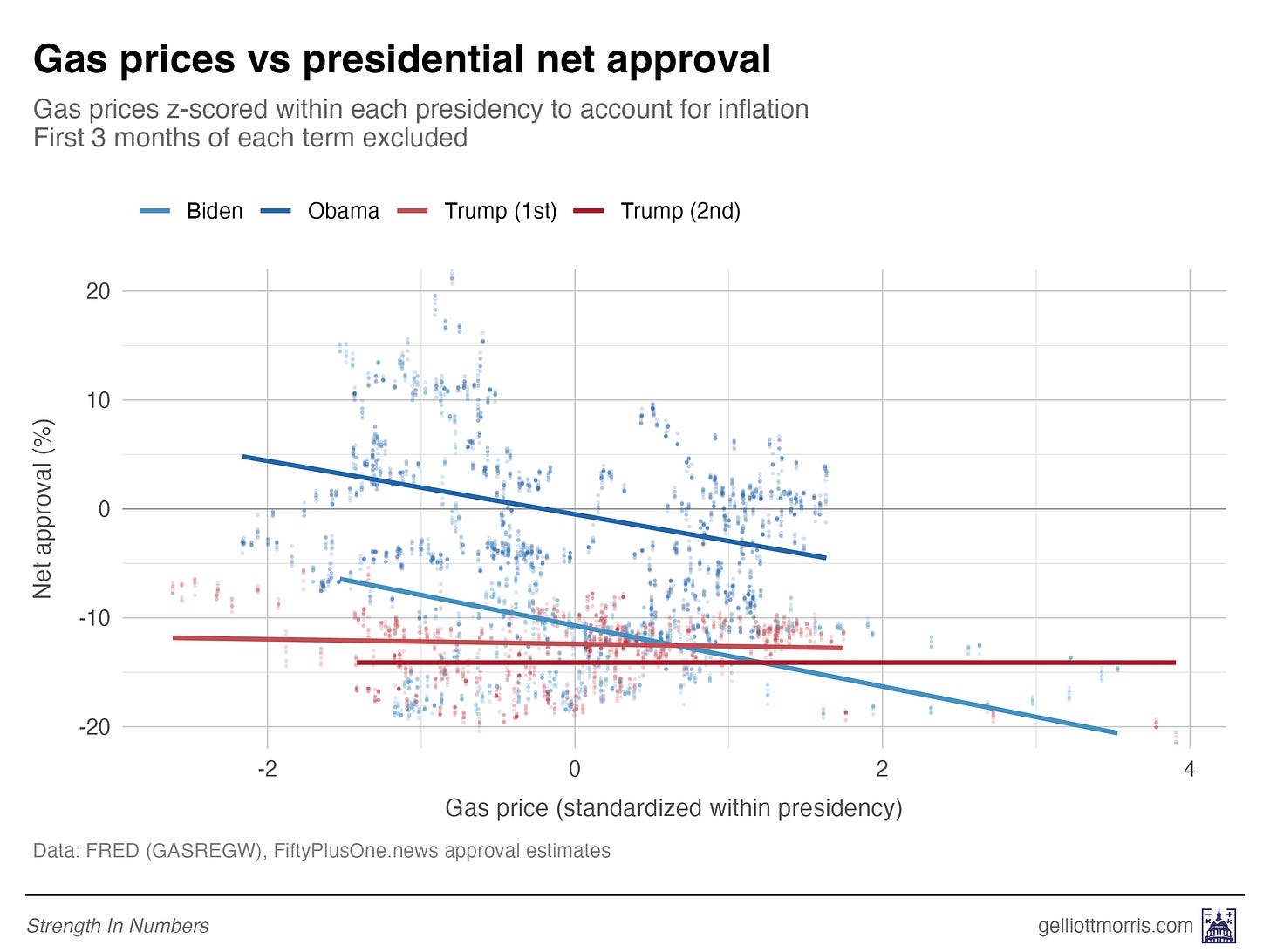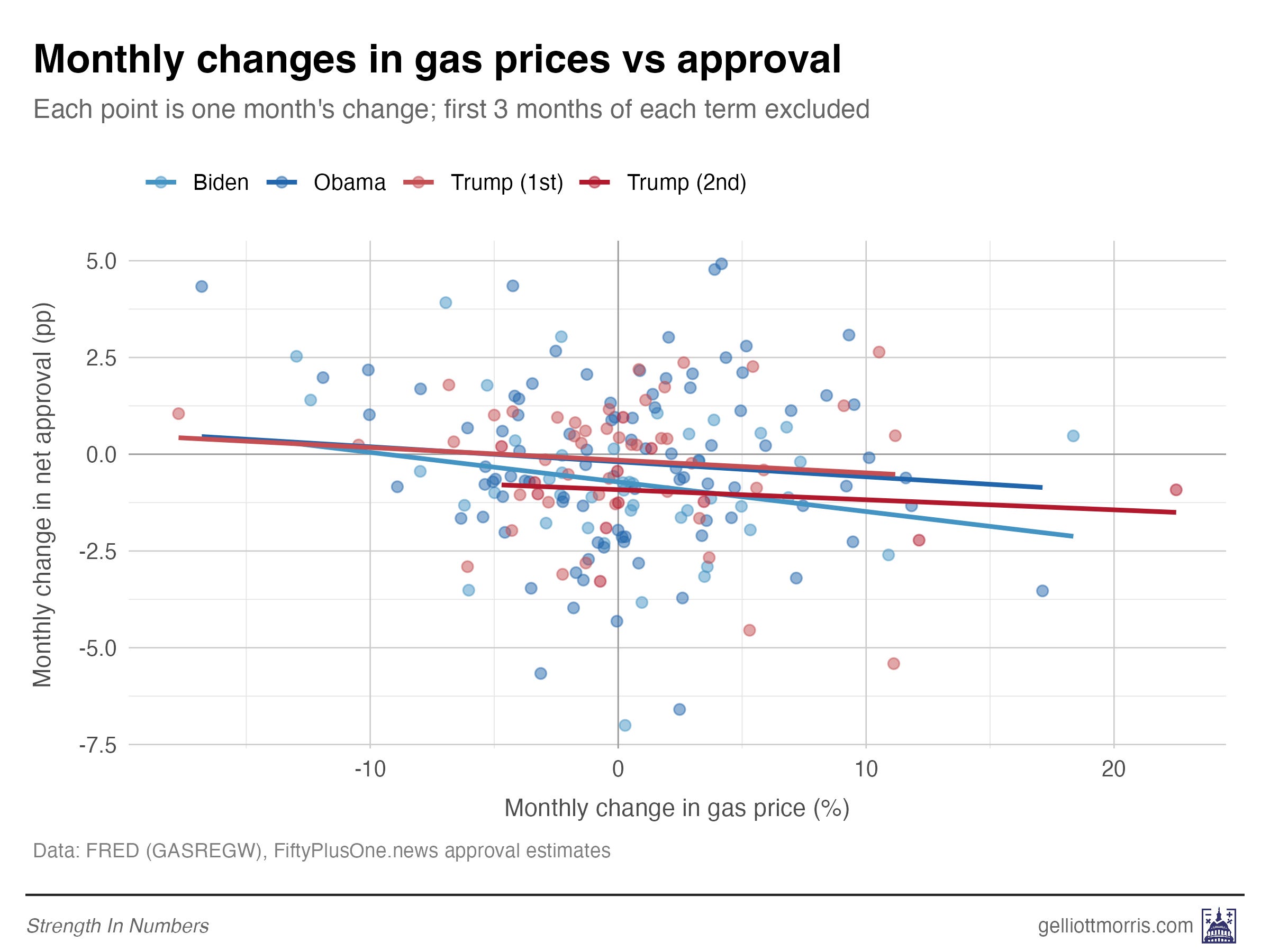 Obama and Biden both show clear negative slopes — higher gas prices, lower approval. But both Trump lines are basically flat. Gas prices explain almost none of the variation in his approval. Again, that’s try historically, but might not remain true in the future!