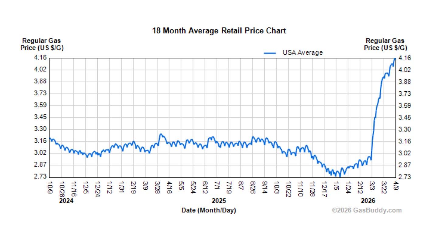 But gasoline prices haven’t declined yet. They usually do, with a lag of a few weeks — but gas is still up nearly 40% since the conflict began in late February, so it has a long way to fall back to “normal” levels. Here are two charts of oil and gas prices I found online: