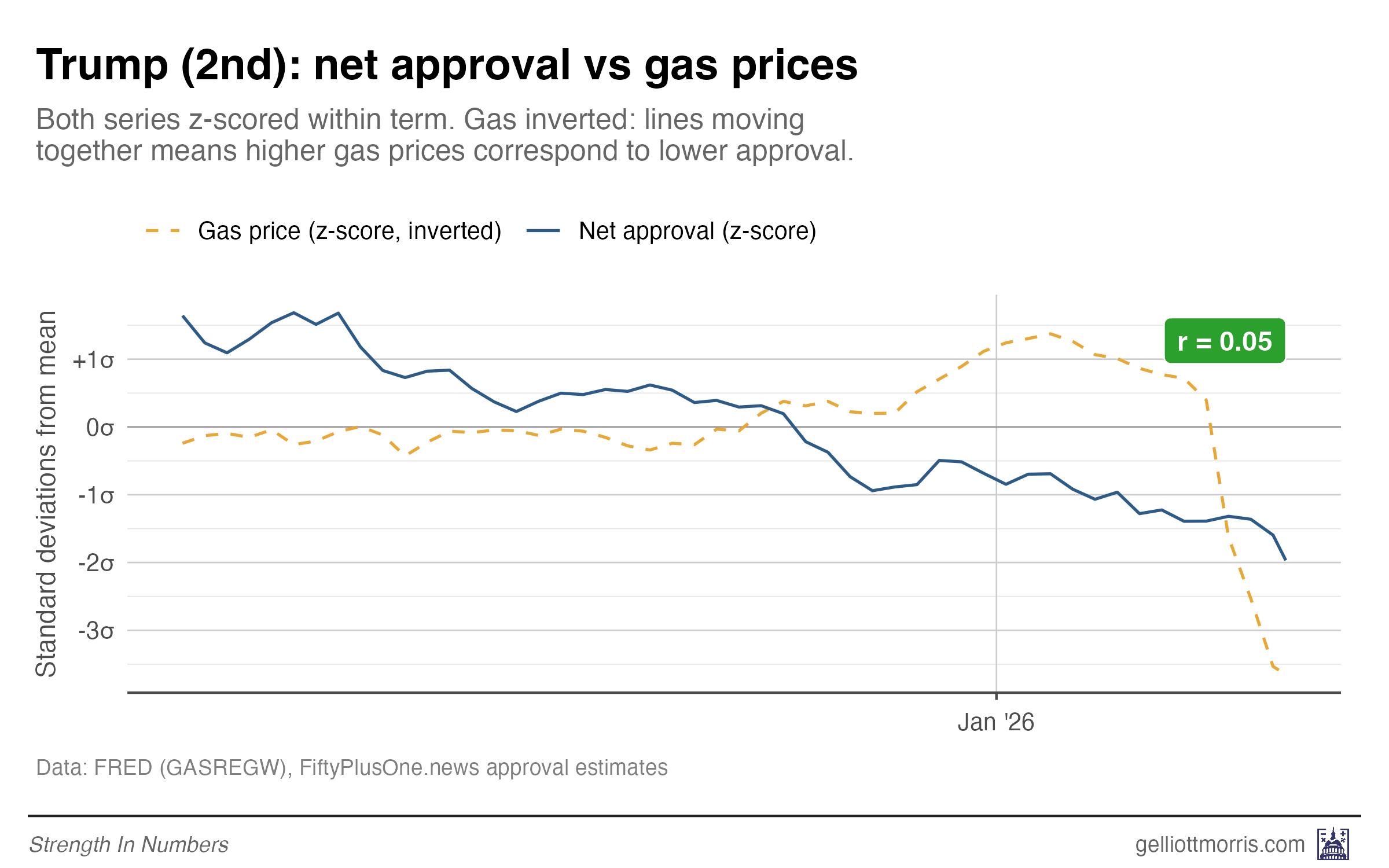 Under Obama, gas price spikes in 2011–12 lined up neatly with approval dips. Under Biden, the 2022 gas price surge tracked almost perfectly with his collapse in the polls. But Trump’s approval has not been as responsive to prices at the pump. That’s partly because gas was pretty cheap for most of his first term, so we don’t have a whole lot of examples of high gas prices under Trump. We are currently pushing the boundaries on that, however.