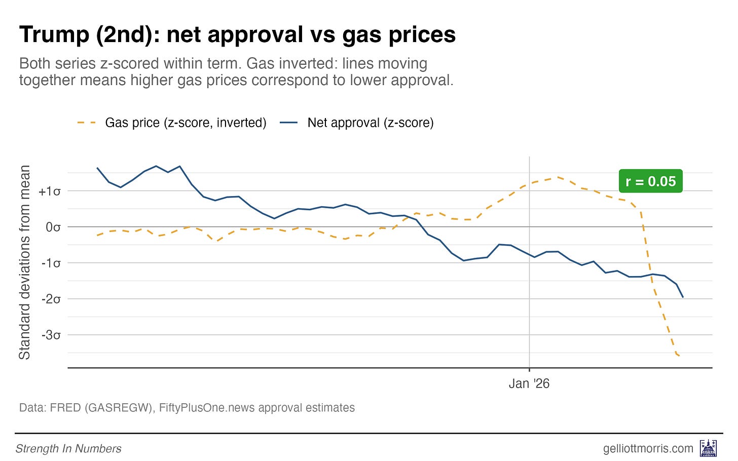 One question subscribers have been asking me this week is: If gas prices do fall back to normal levels, will Trump’s approval recover to what it was before the war in Iran broke out? Chart of Trump’s approval, from FiftyPlusOne.news, below. There has been a small rebound in Trump’s net rating over the last week, but it’s inside the uncertainty interval and could be noise.