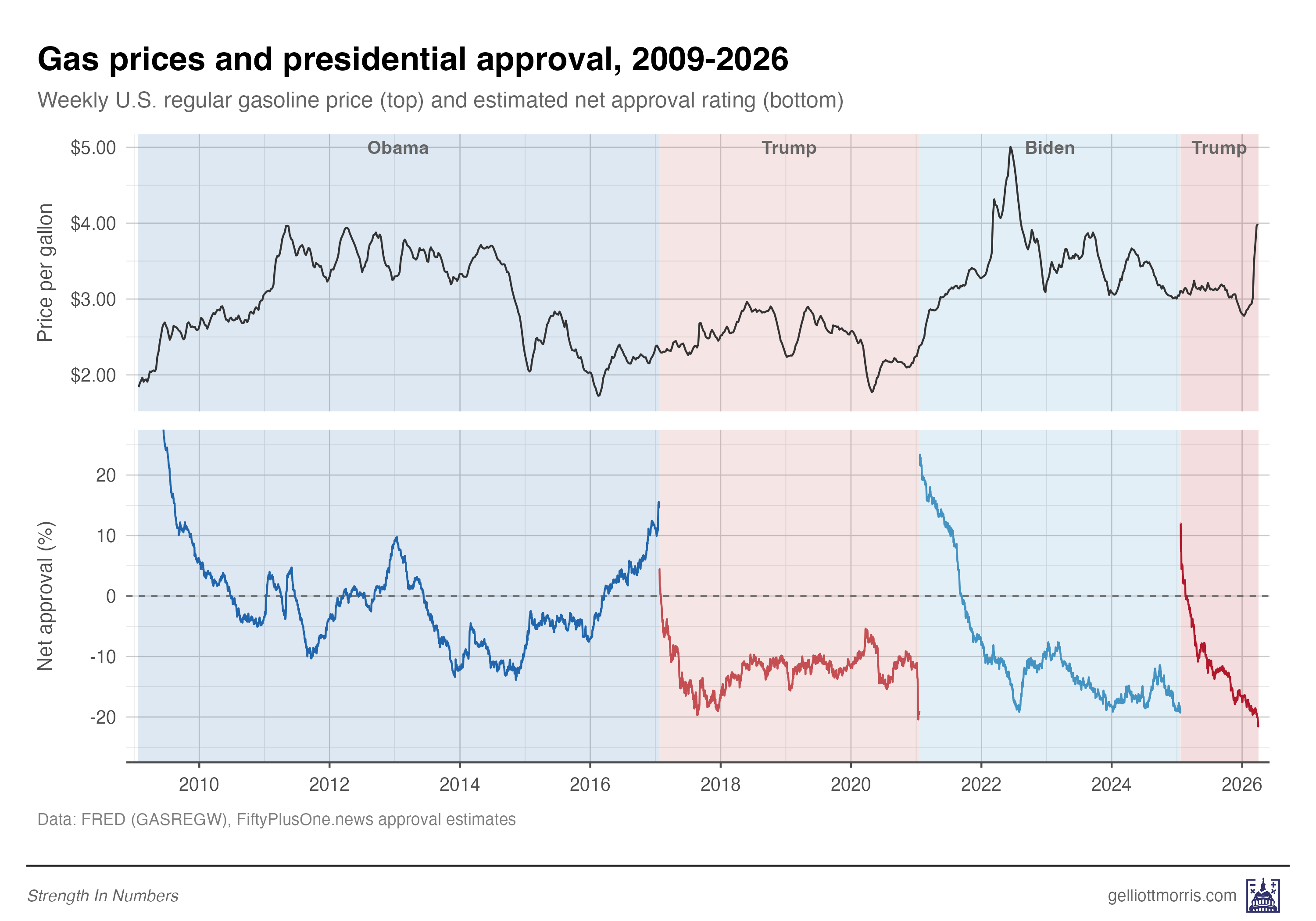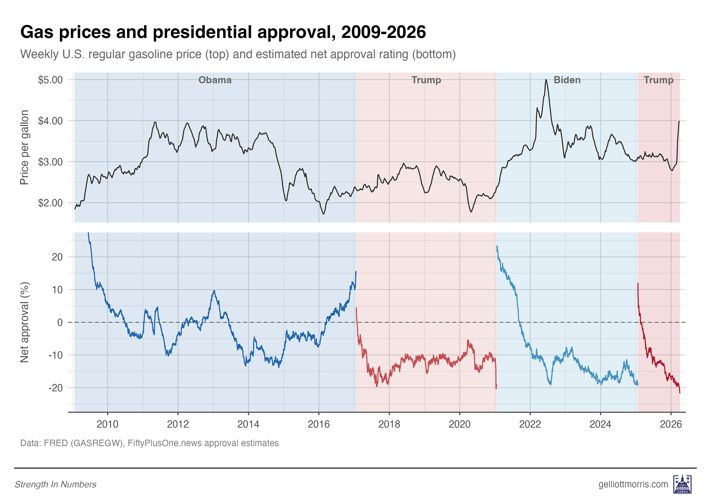 Here’s the full 2009–2026 view of both gas prices and presidential net approval rating. Gas prices are on top, with net presidential approval on the bottom. Shading represents which party is in control of the presidency.
