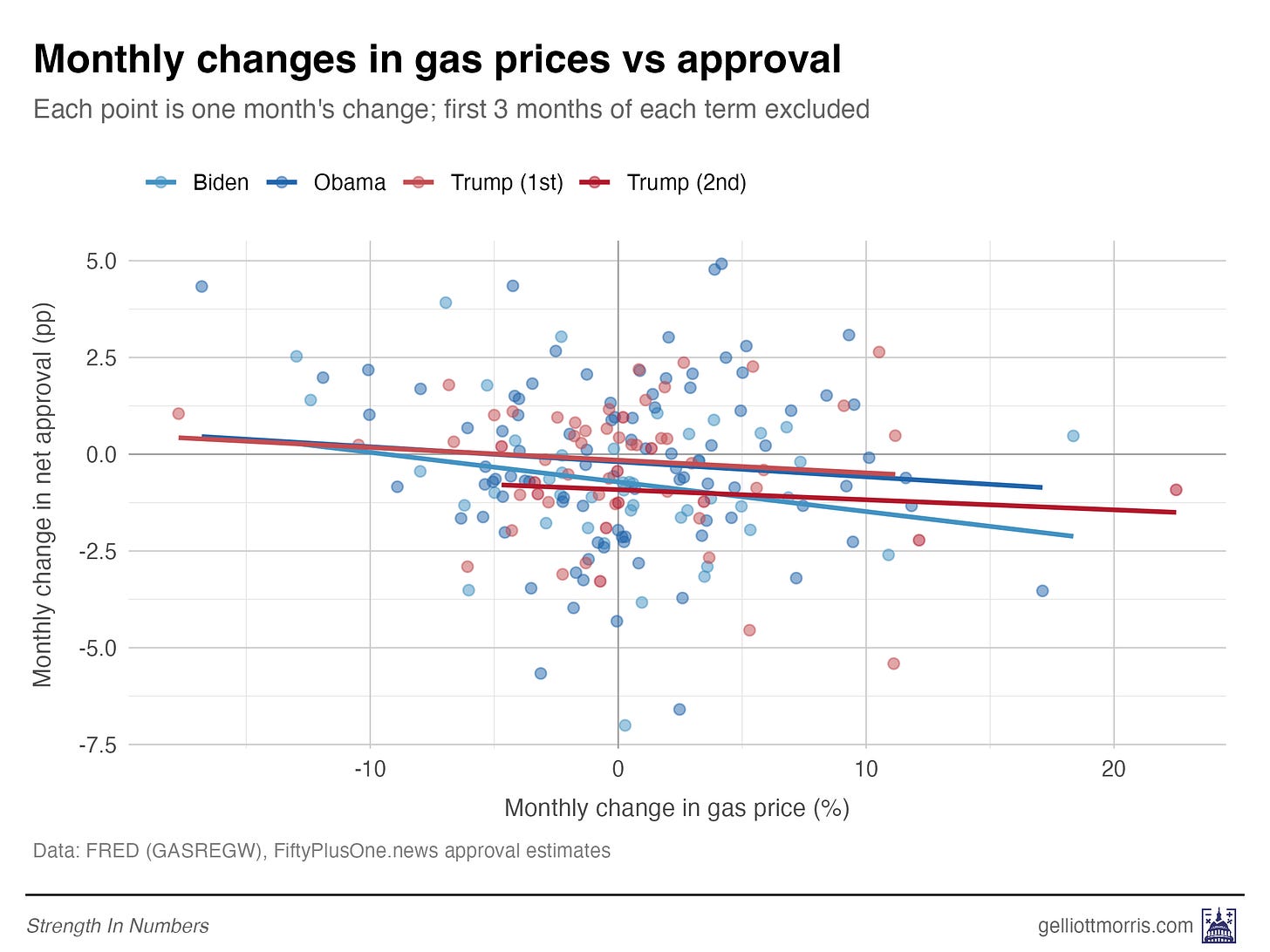 Finally, let’s take a look at monthly changes rather than levels. Each dot here is one month: the x-axis is the percent change in gas prices over the last month, while the y-axis is the change in net approval (in percentage points) over the same time period.