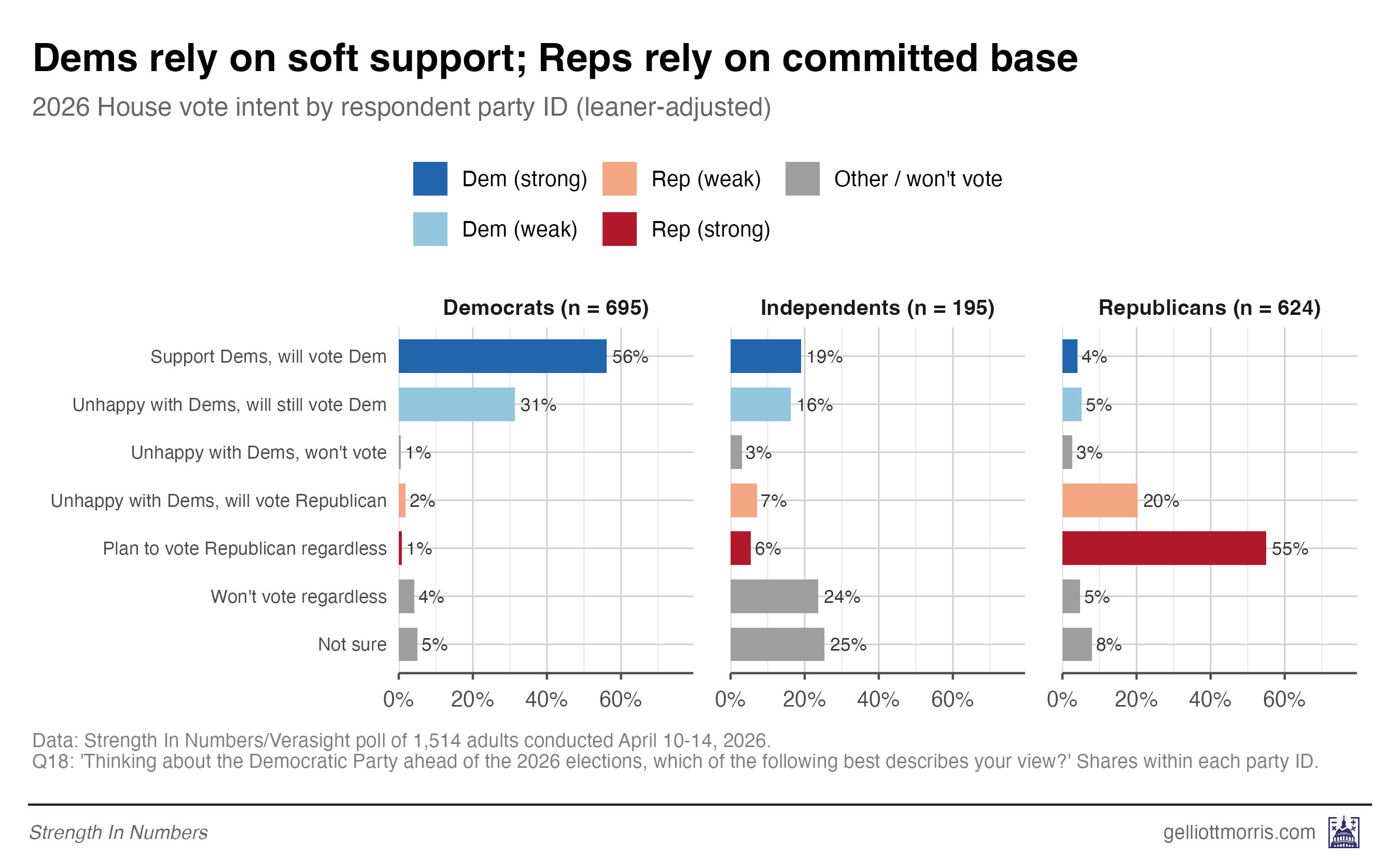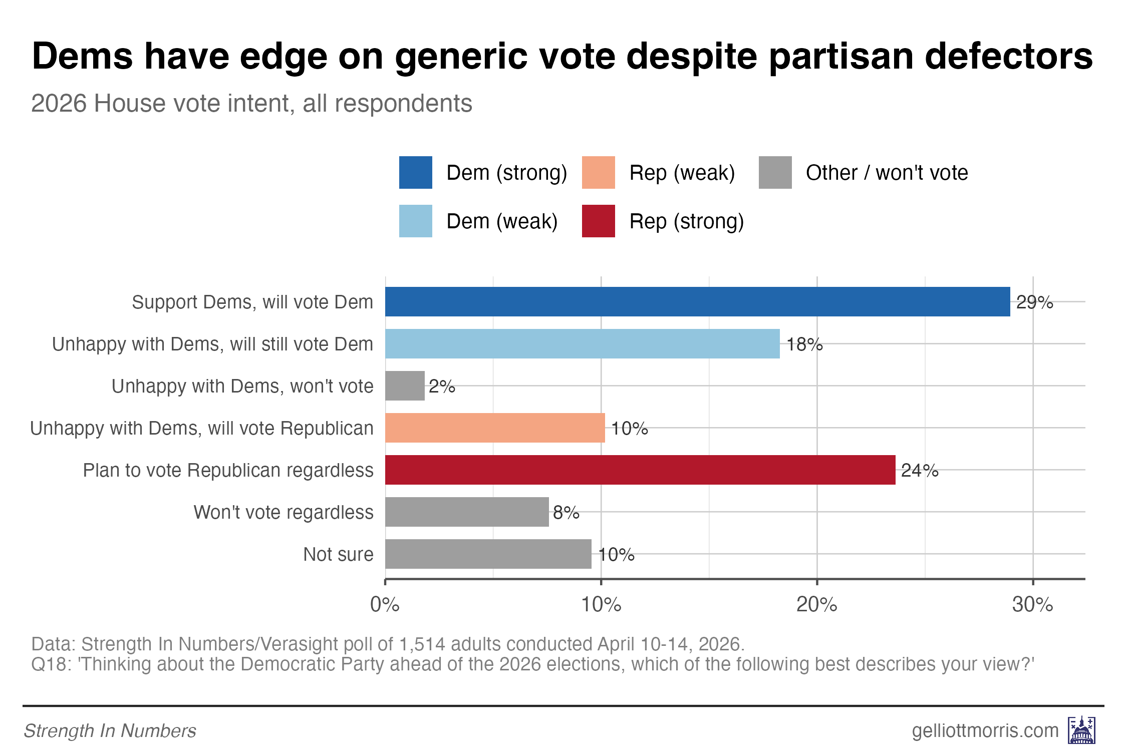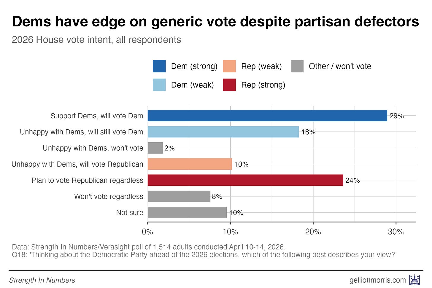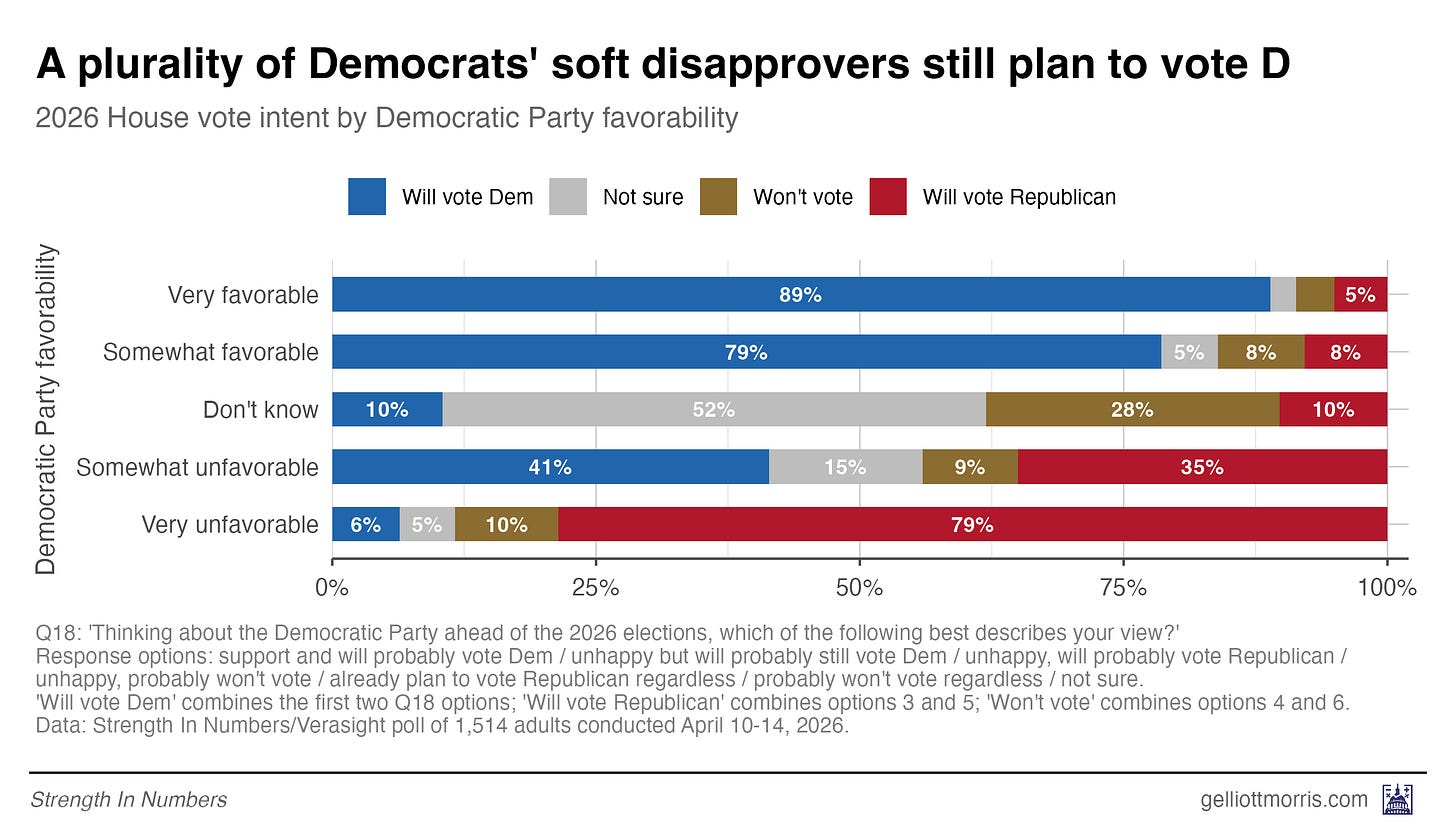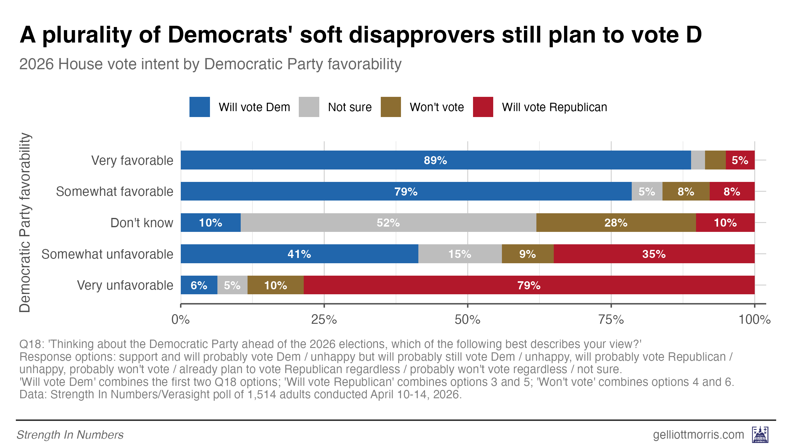 Unhappy but still voting Democratic: Among voters with an unfavorable view of the Democratic Party, 16% say they’ll vote Democratic in 2026 anyway. Among the “somewhat unfavorable” slice, 41% still plan to.