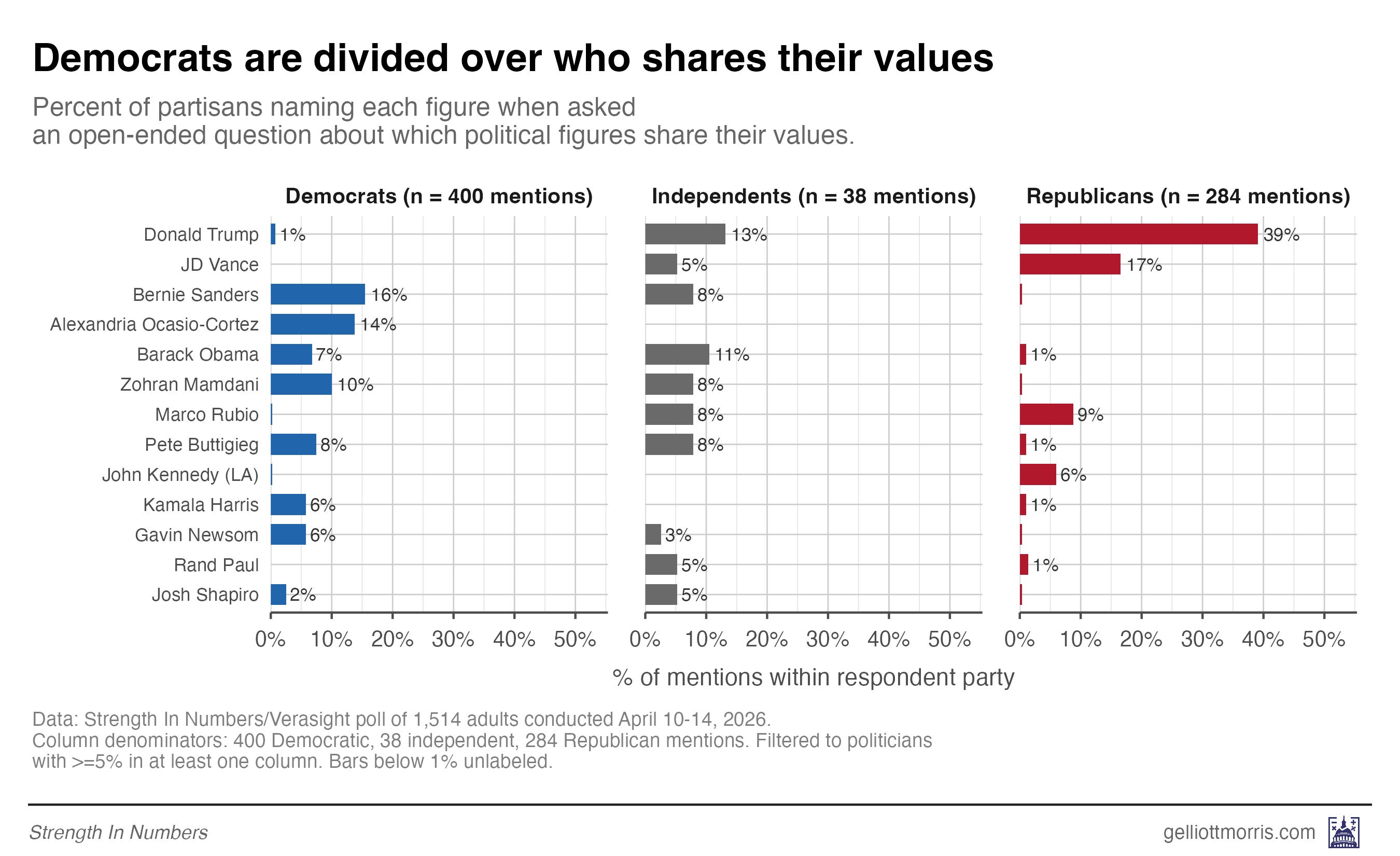 One more look at the “strong leadership” gap before we move on. We asked respondents to name, in their own words, a political figure whose values they share. Among Republican respondents, Donald Trump and JD Vance dominate — no one else is anywhere close.