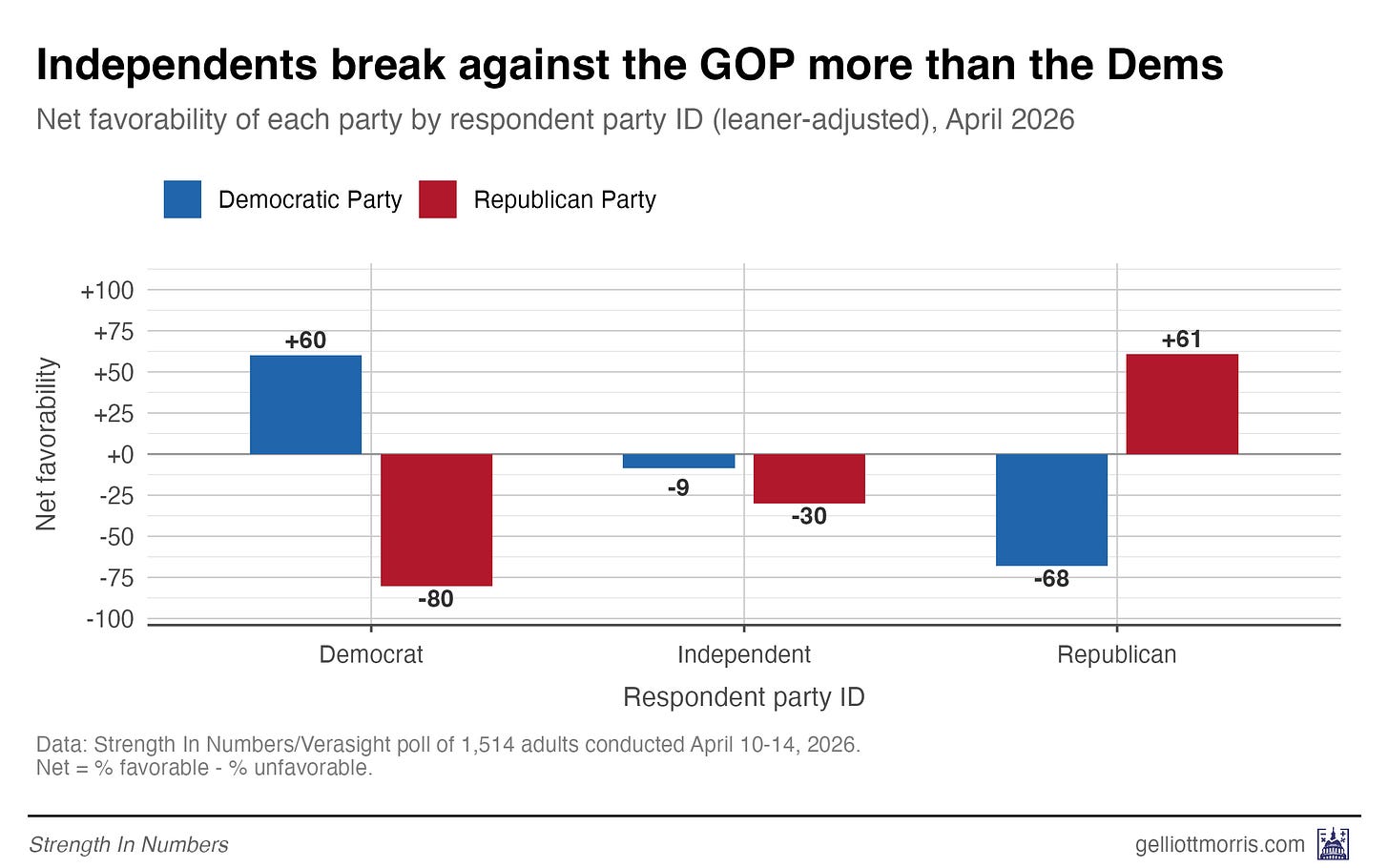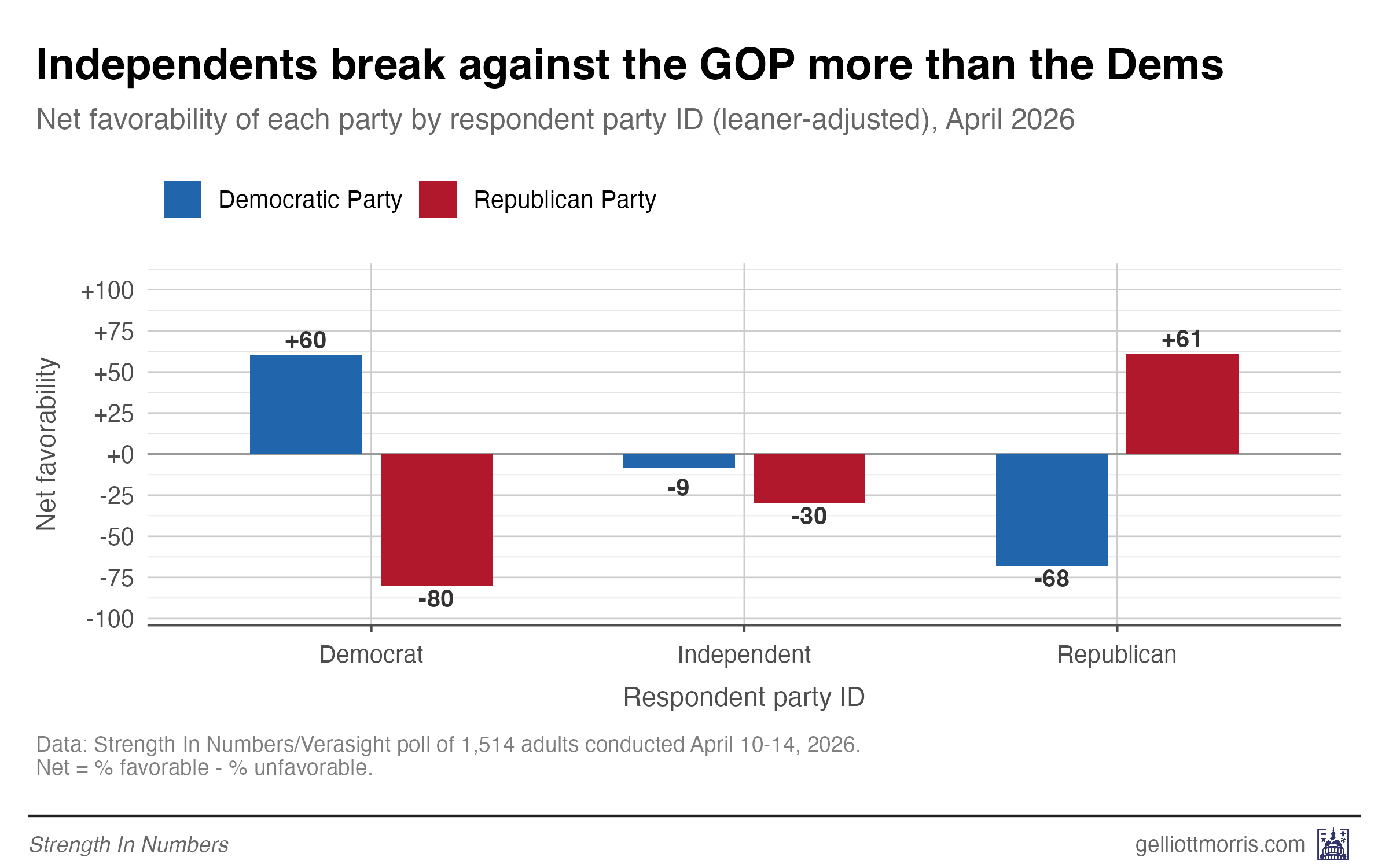 Split the numbers by party ID and the reason Republicans are doing so poorly in the topline really becomes clear. Democrats rate their own party at net +60, while Republicans rate theirs at a net +61. This is a (predictable) reversal from 2025: there is no evidence here that Democratic voters are disenchanted with their own brand in some way that Republicans are not.