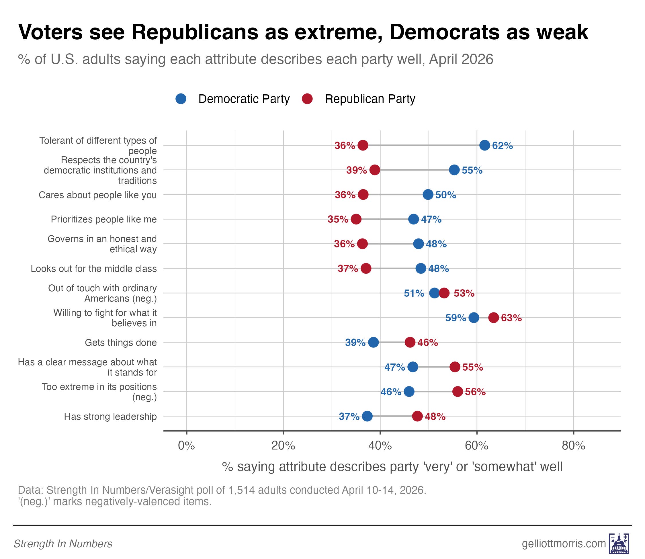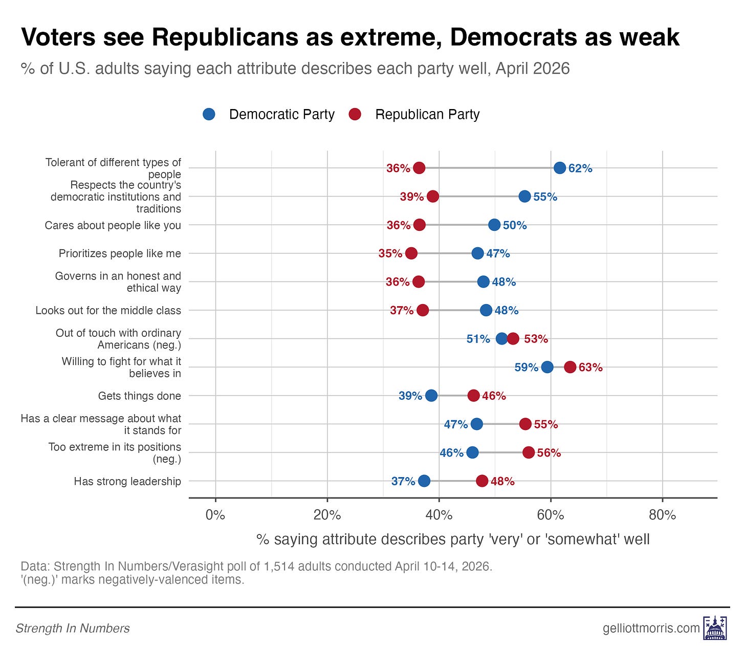 What all of this suggests is that Democrats do not have the problem many political narratives say they do. The party’s core weakness is not that voters see it as elitist or too extreme; it is that too many voters, including their own, see Democratic politicians as unmoored, passive, and ineffective. Republicans, by contrast, still project the kind of strength and clarity that voters often reward — though their extremism is a huge drag on votes.