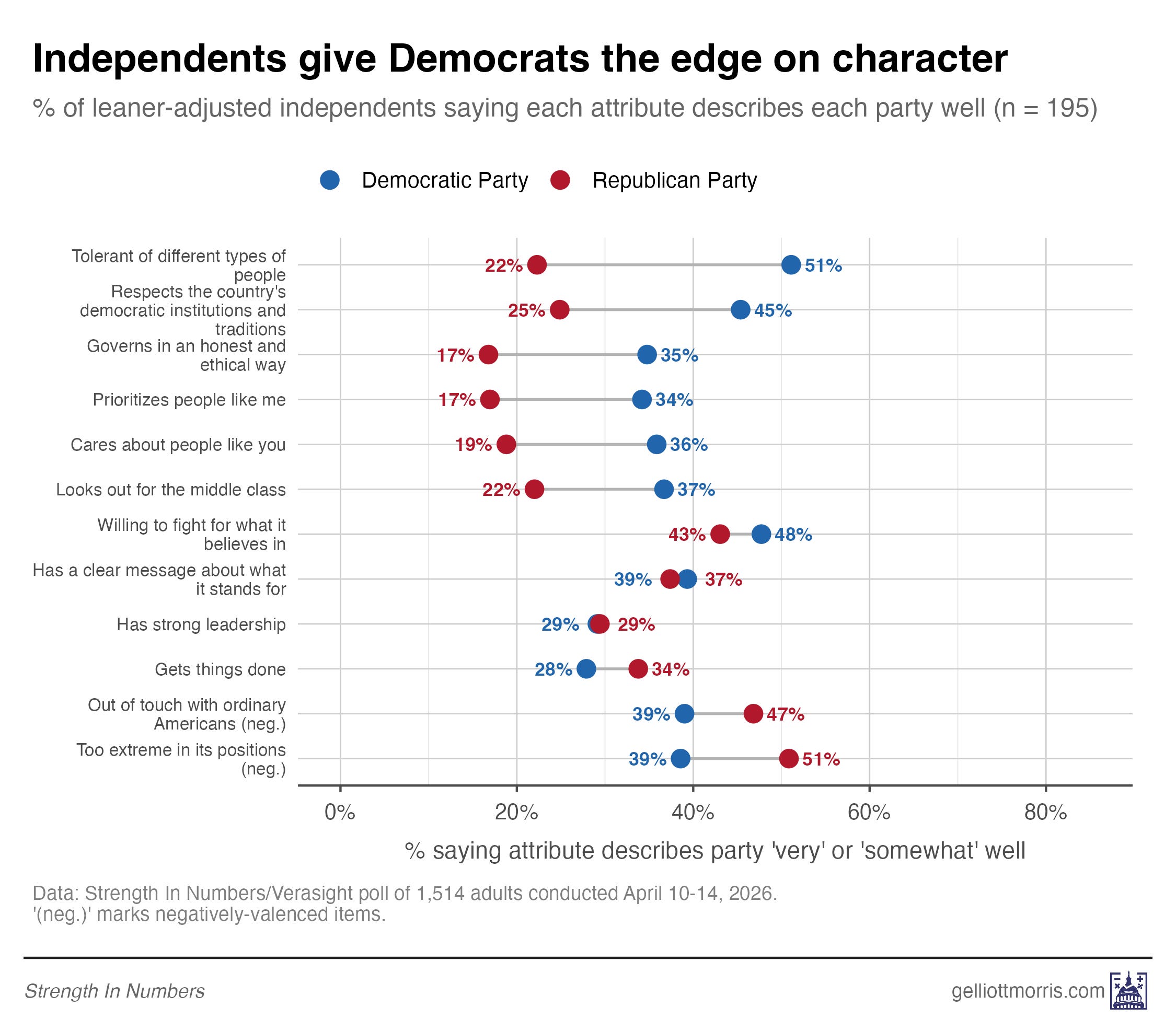 Independents give Democrats the edge on tolerance, honesty, caring about ordinary people, respecting institutions, and looking out for the middle class. Republicans hold their advantage on strong leadership, clear messaging, and getting things done — though the margins shrink compared to all adults. And independents view the Republicans as “too extreme,” just like the general public does.