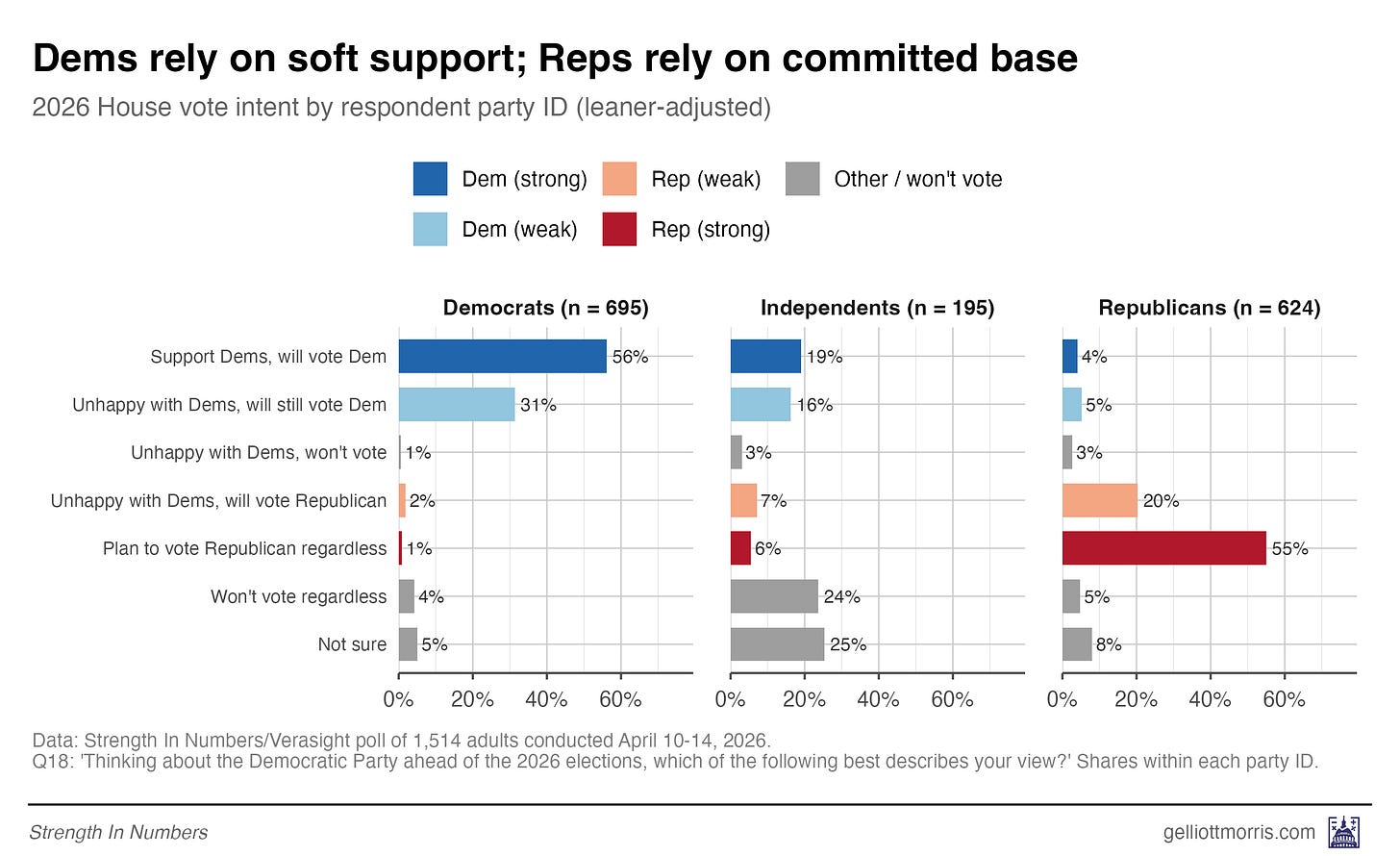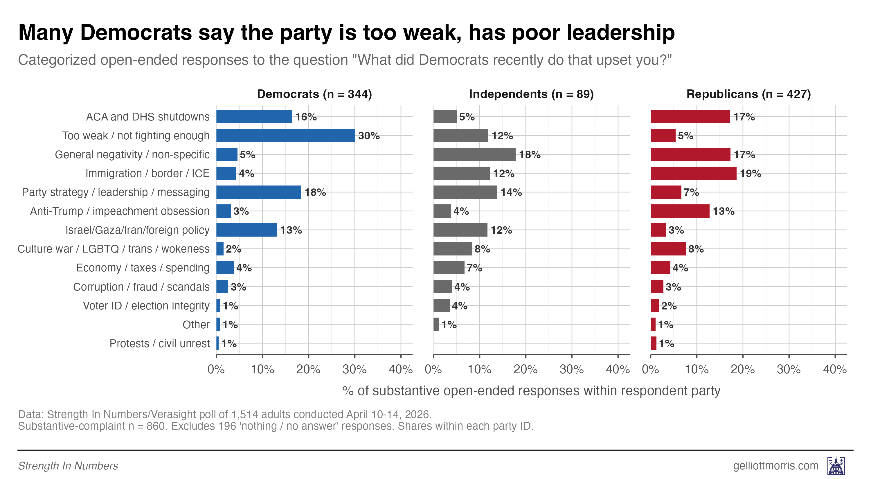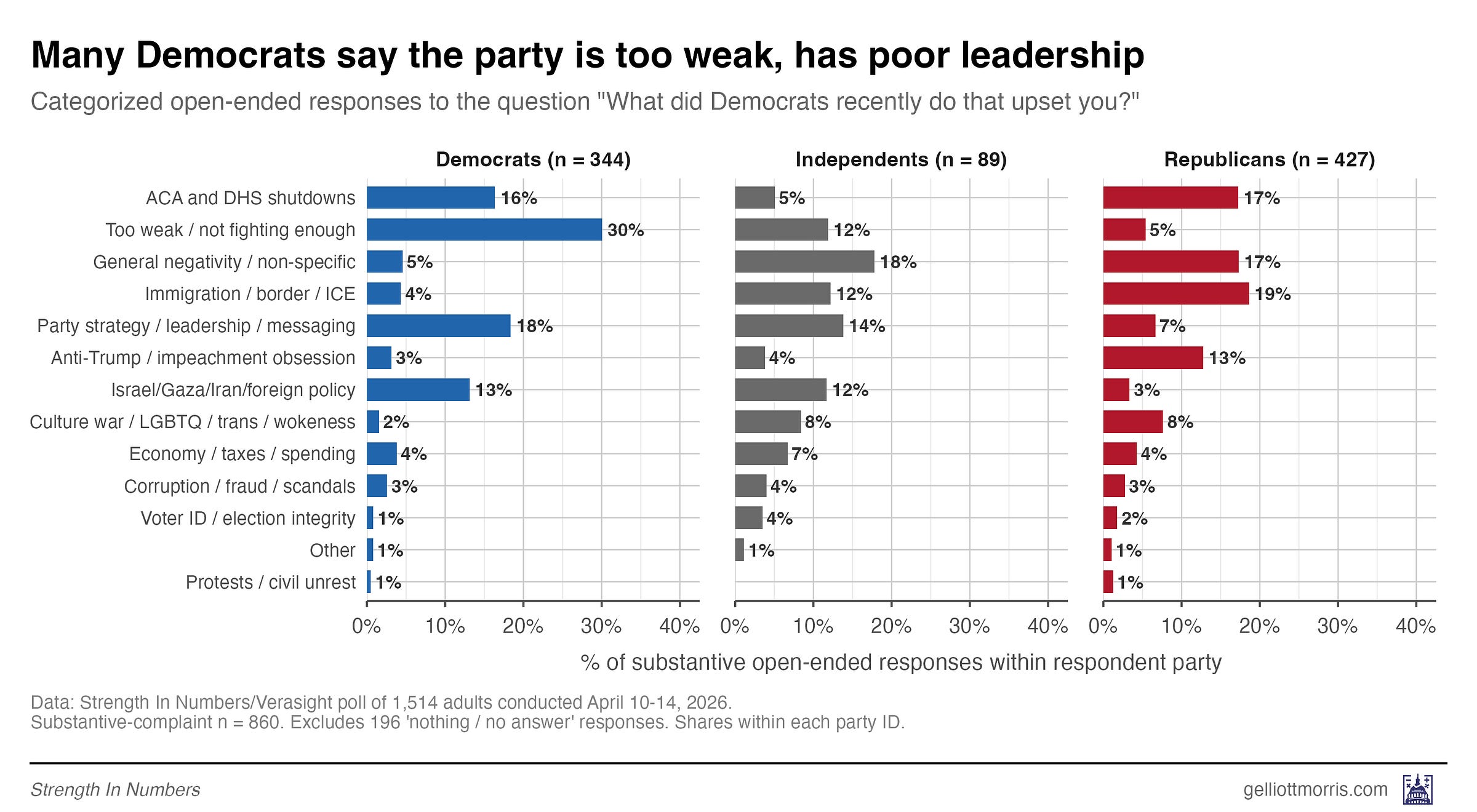 Among Democratic respondents, the single most common complaint about their own party is that it is too weak, too cautious, or not fighting hard enough — 30% of substantive answers fall into that bucket, and another 17% are still mad about the party caving in last fall’s shutdown fight without winning an extension of ACA premium subsidies (a few also cite the failure to extract concessions on ICE). That runs ahead of every substantive policy concern, including on immigration, the economy, Israel/Gaza — you name it.