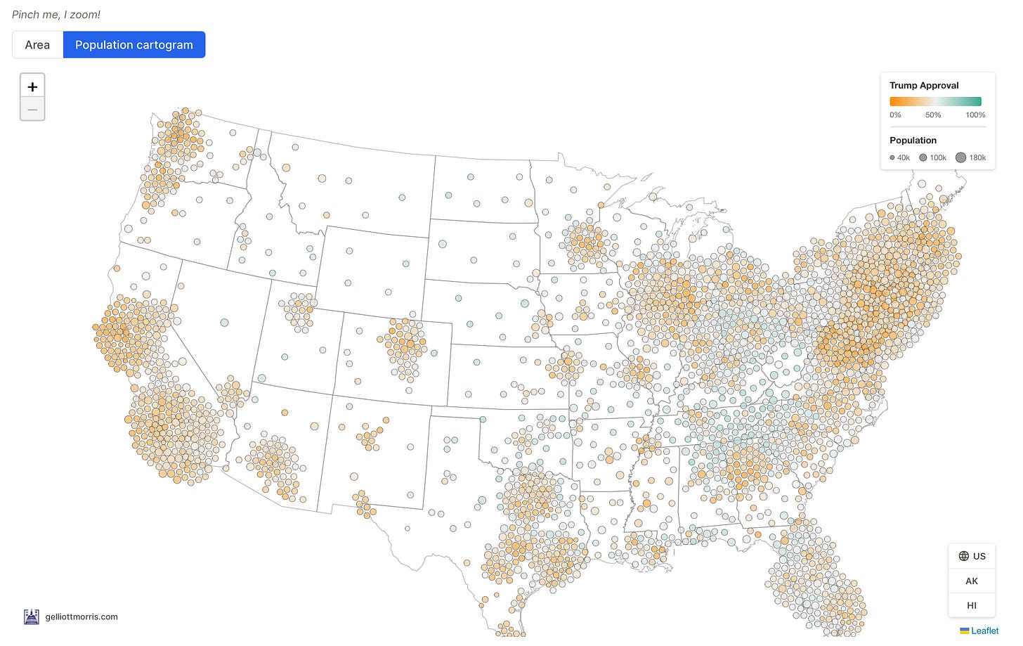 Notice that most of America is orange or white-ish green. Switch the map to geographic area (which you can do on the project website), and you’ll see plenty of teal. Much of the Mountain West, Appalachia, and Deep South look bright green in geographic terms, but few people actually live there. Since the cartogram shows opinions of people where people actually live — in cities and suburbs — the green dots tend to fade into the background.