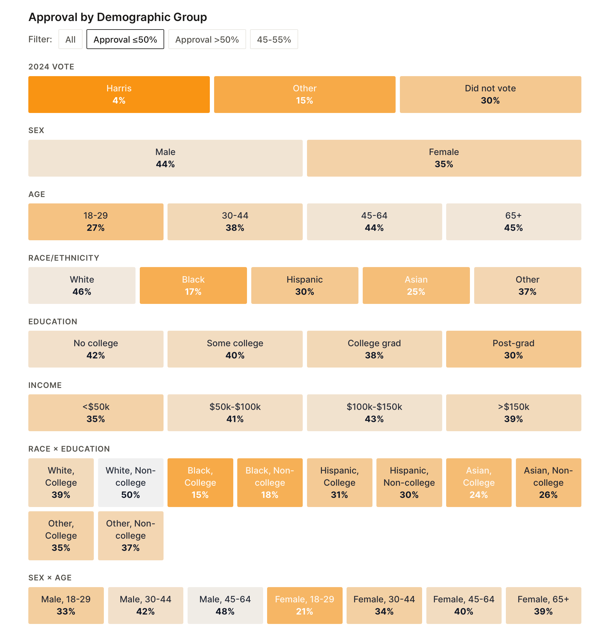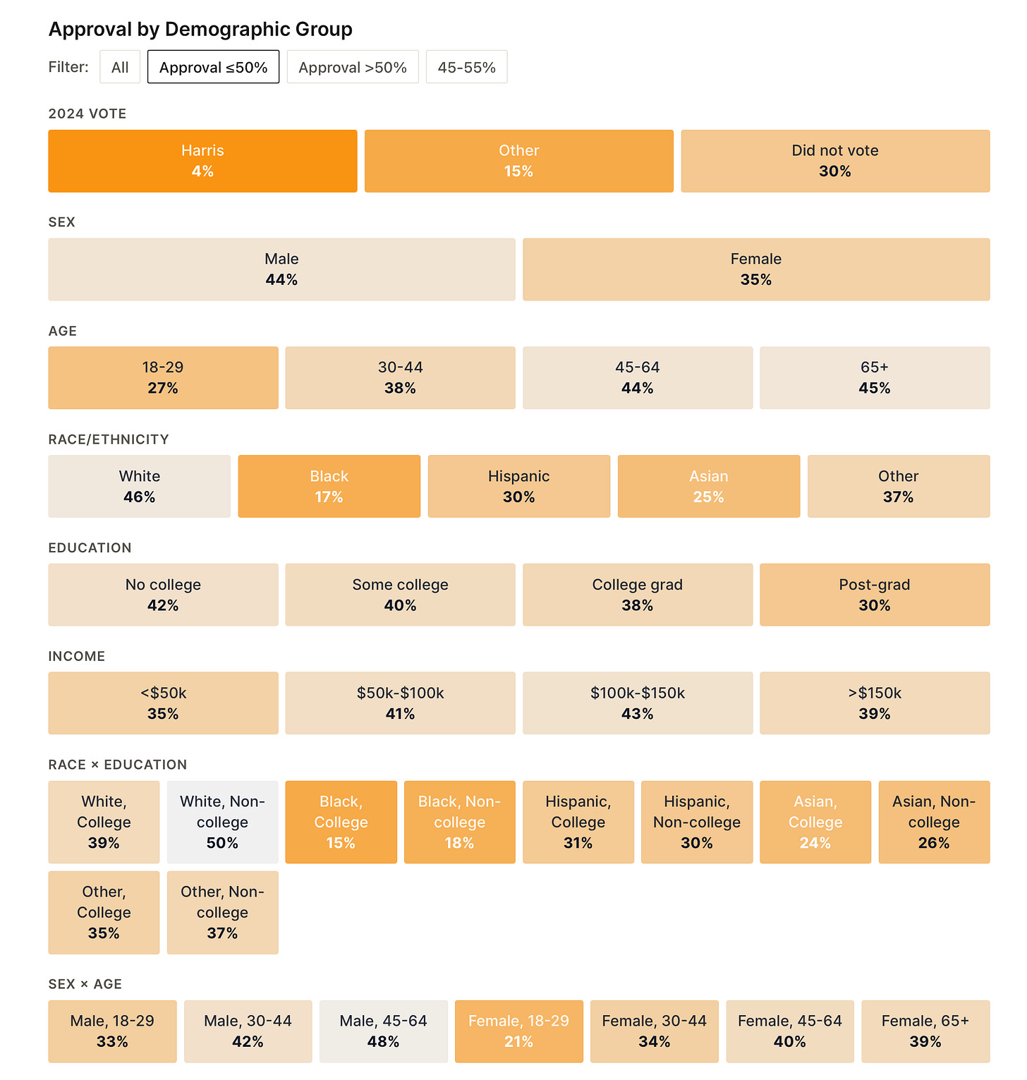 And here’s the reverse — every group where Trump’s approval is under 50%: