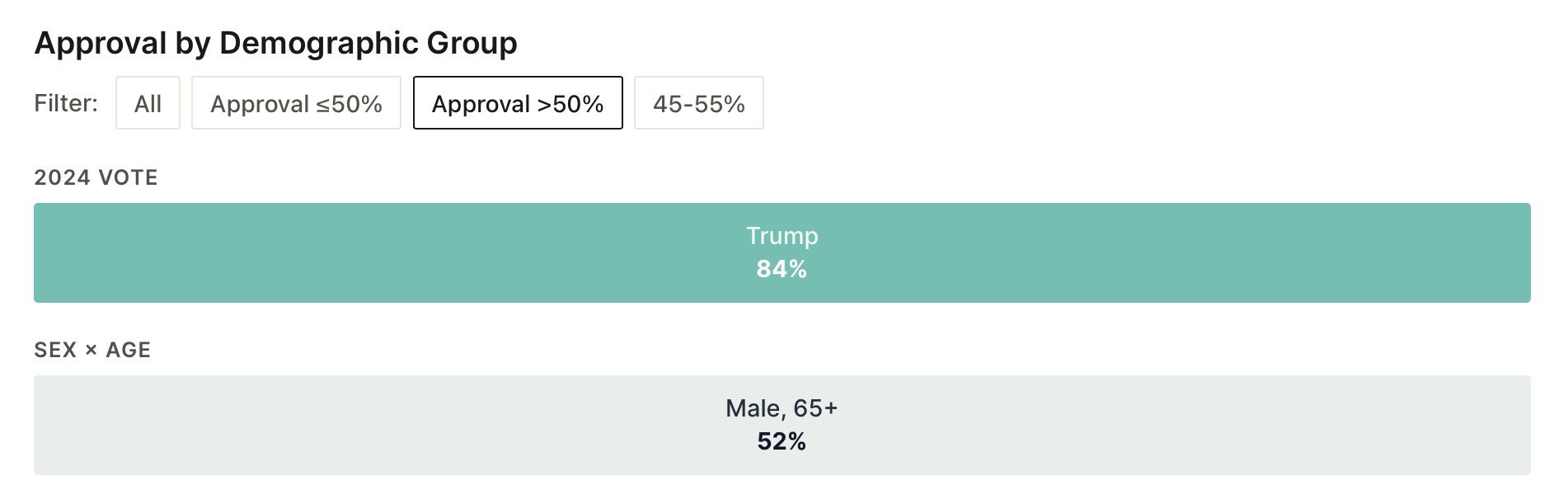 But the map isn’t why I’m writing this piece today. The following two graphs are. This table lists every demographic group for which Donald Trump’s approval rating is above 50%: