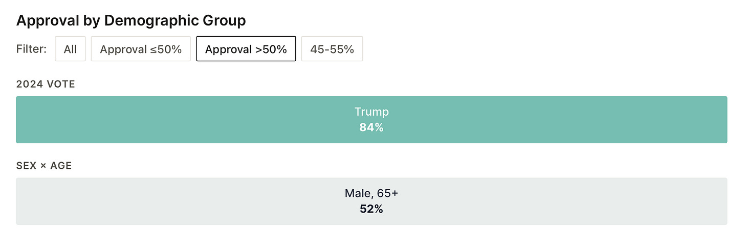 Even some of the groups that went strongest for Trump in 2024, like white voters without college degrees and older men, are bunched in the low-to-mid 40s. There is no group short of his own 2024 voters where Trump cracks 60% approval. The only way you get to a sub-40 approval rating is to lose a little bit, among every type of voter, everywhere.