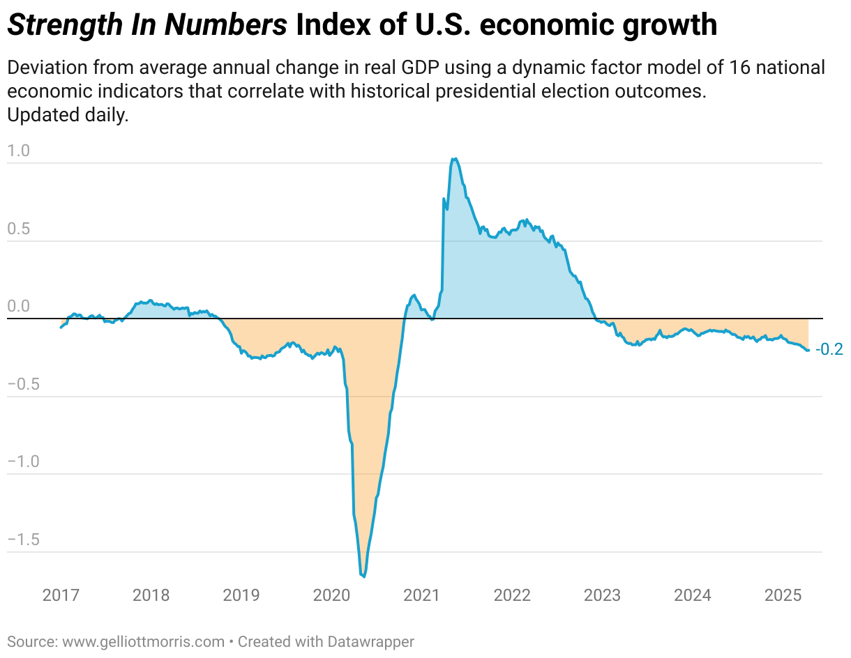 First, I’ve just uploaded an initial release of my index of economic growth to the Strength In Numbers data portal. Trump’s approval rating — now at net -6 — is also updated there. I plan to make revisions to the model powering the economic index, which I’ve released publicly online, and to very soon incorporate it into a Cost Of Ruling Index that captures both political and economic conditions. Stay tuned for that.