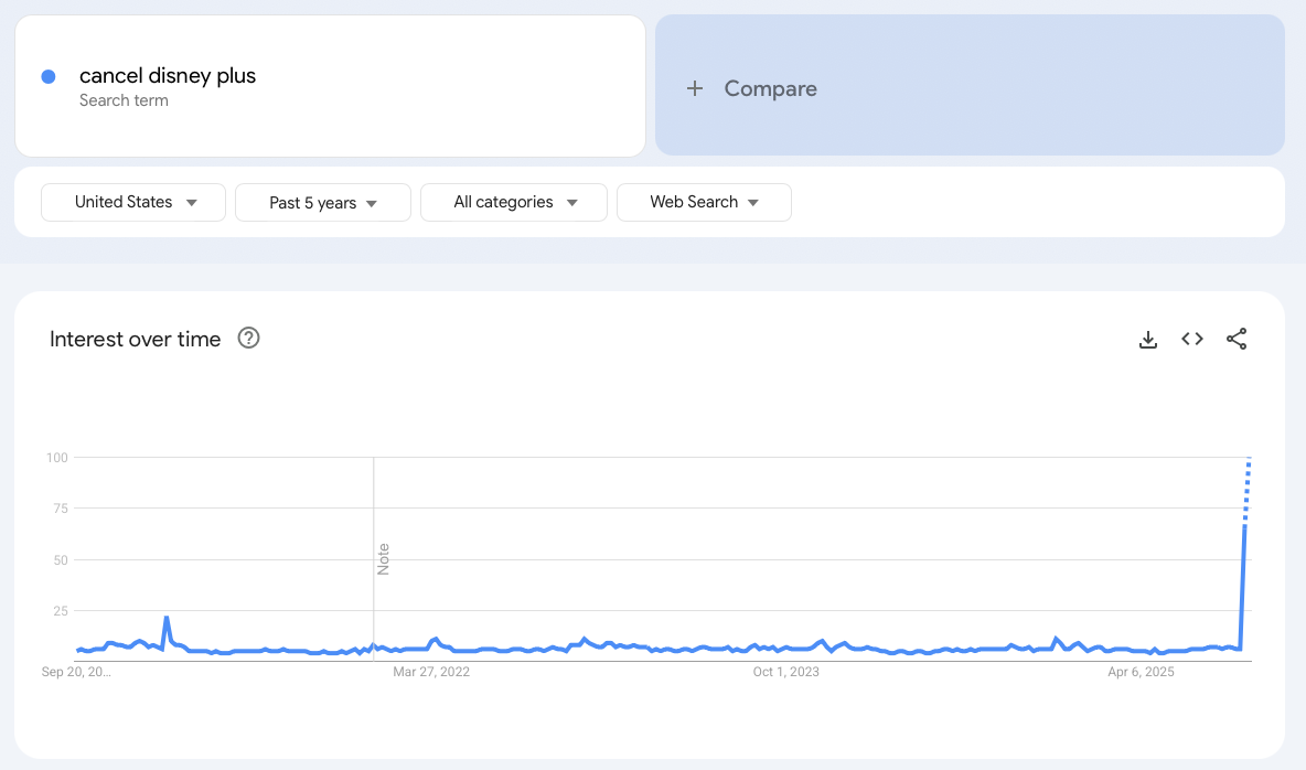 Last week, ABC/Disney canceled Jimmy Kimmel’s late-night show after the chairman of the Federal Communications Commission, Brendan Carr, threatened to revoke the broadcast licenses of television stations that carry the program. The backlash has been swift: As I pointed out Saturday morning, search interest for “Cancel Disney+” has hit an all-time high — even higher than the boycott movements from when Disney “went woke” in 2020-2022. The current Disney boycott is now 4x as large as any over the last 5 years, gauged by search interest: