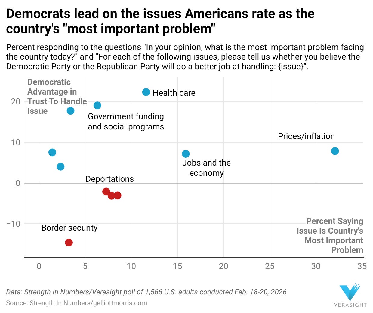 This is the worst monthly tracker for the Trump administration since we began the Strength In Numbers/Verasight poll in May 2025. The president’s job approval has cratered to net -22 and now, for the first time, he doesn’t have a single positive issue approval rating. The Democratic lead on the congressional generic ballot has widened to D+10 among registered voters — higher than the vote share they won in the 2018 “blue wave.”