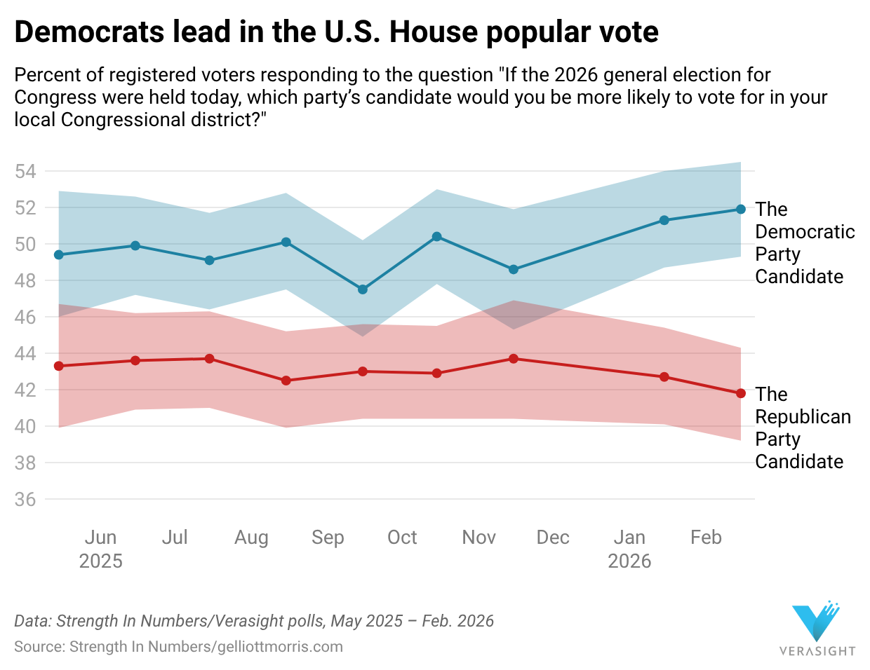 Among registered voters, Democrats lead the generic House ballot 52% to 42%, with just 6% undecided. That’s a 10-point margin — up from the 8-point lead we recorded in January and the widest advantage in the history of the Strength In Numbers/Verasight poll.