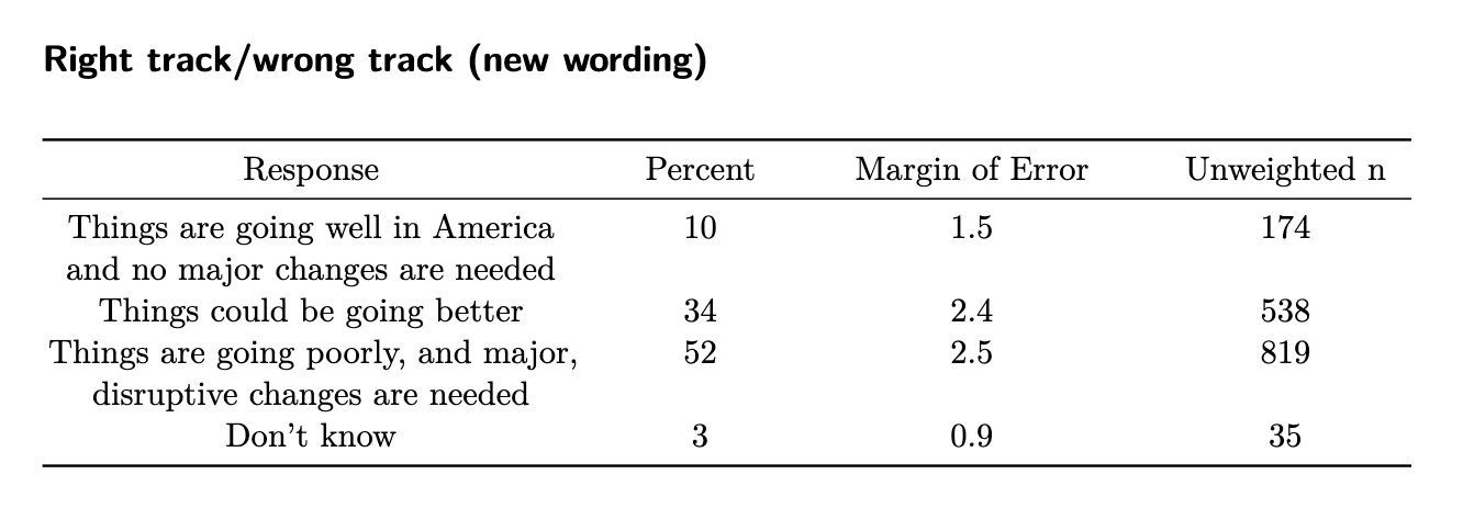 Only 10% of Americans say things are going well in the country right now. Another 34% say things could be going better, while a majority — 52% — say things are going poorly and major, disruptive changes are needed.