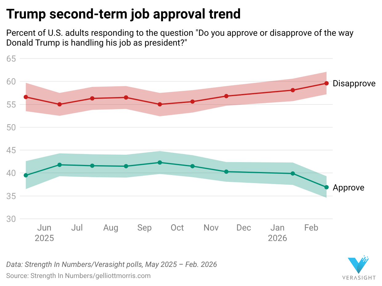 Methods statement: Verasight collected the data for this survey from February 18-20, 2026. The sample consists of 1,566 United States residents ages 18 and above. The data are weighted to match population benchmarks of age, race/ethnicity, sex, income, education, region, metropolitan status, partisanship, and past vote. The margin of sampling error is +/- 2.5%. Topline document prepared by G. Elliott Morris for Strength In Numbers. While Strength In Numbers had input on question wording, all other methodological decisions were made and carried out by Verasight to ensure independence of the data-generating process behind these results.