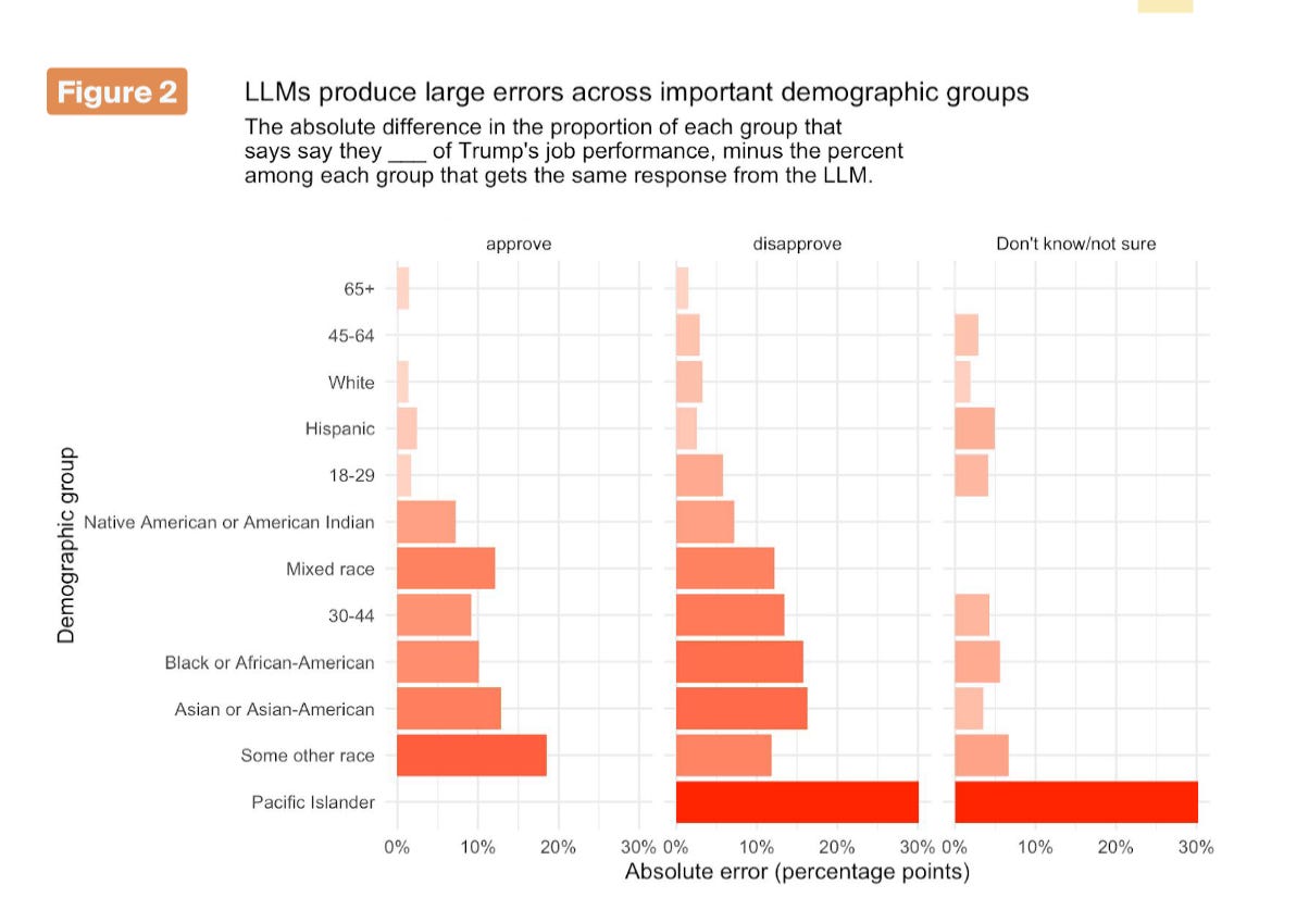 For core demographic subgroups, the average absolute subgroup error was ~8 points; errors for some key groups (e.g., Black respondents) were as large as 15 points on Trump disapproval, and smaller groups had larger errors still (30 percentage points for Pacific Islanders). This is unusable for serious analysis.