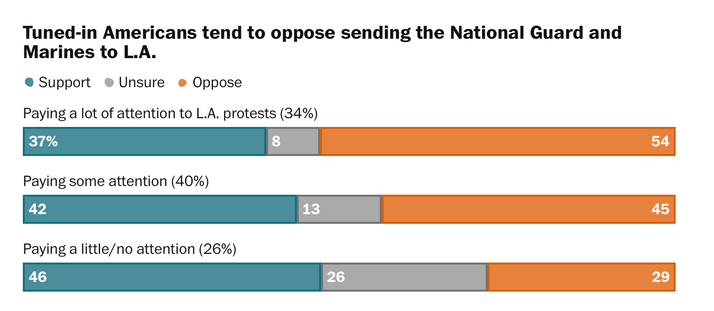 According to the Post/GMU crosstabs, the more closely Americans are following the news in LA, the less they like the idea of soldiers on city streets. Net approval for Trump's actions is 17 points underwater among the 34% of people who say they are paying "a lot of attention" to the protests, versus +27 among people who aren't.