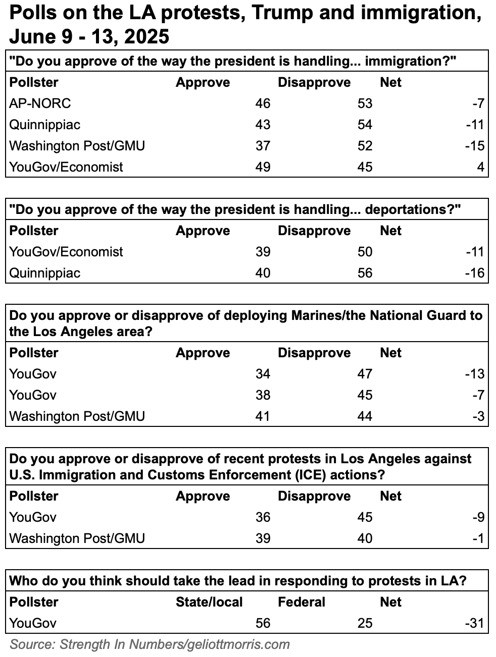 I have struggled to come up with more to say on the Los Angeles protests that isn't repetitive of some of the great things other people are writing on the subject. But then it struck me that it may be useful to readers of this newsletter for someone to publish one piece containing all the public opinion polling we're getting about the protests and the surrounding issues.