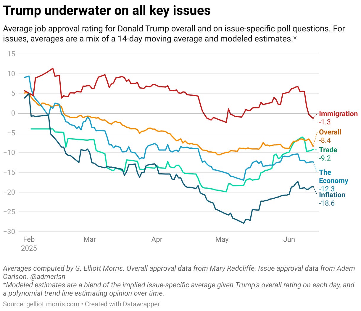Trump's overall net approval has also fallen in the last week, from -6.5 on June 9, 2025, to -8.4 today, June 13, 2025.