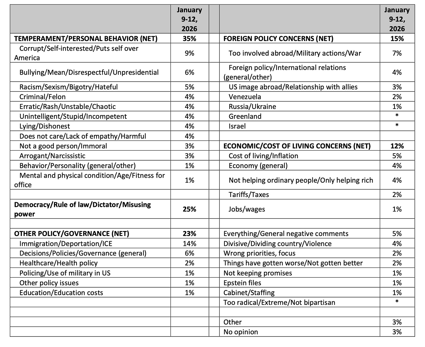 I’m not surprised to see ICE at the top of the list, considering the recent horrors, but there are a dozen of these issues that would tank a normal administration. He’s such a fire hose of destruction that it’s hard to remember it all. Epstein at only 1%? What distraction will he throw at us next?