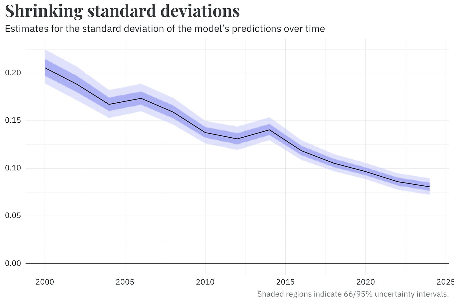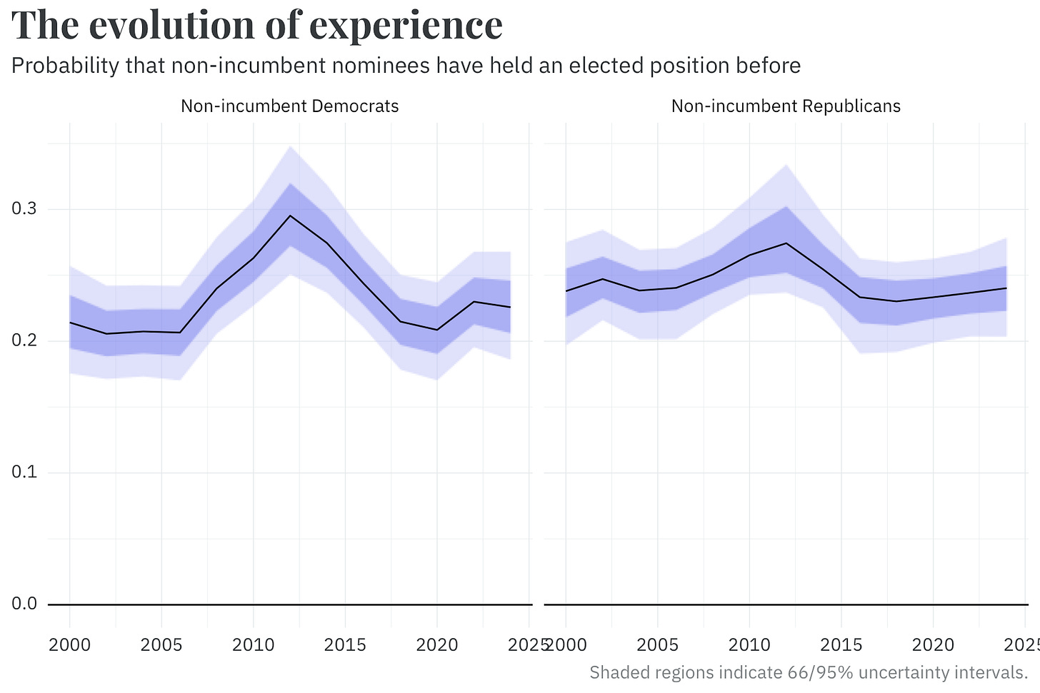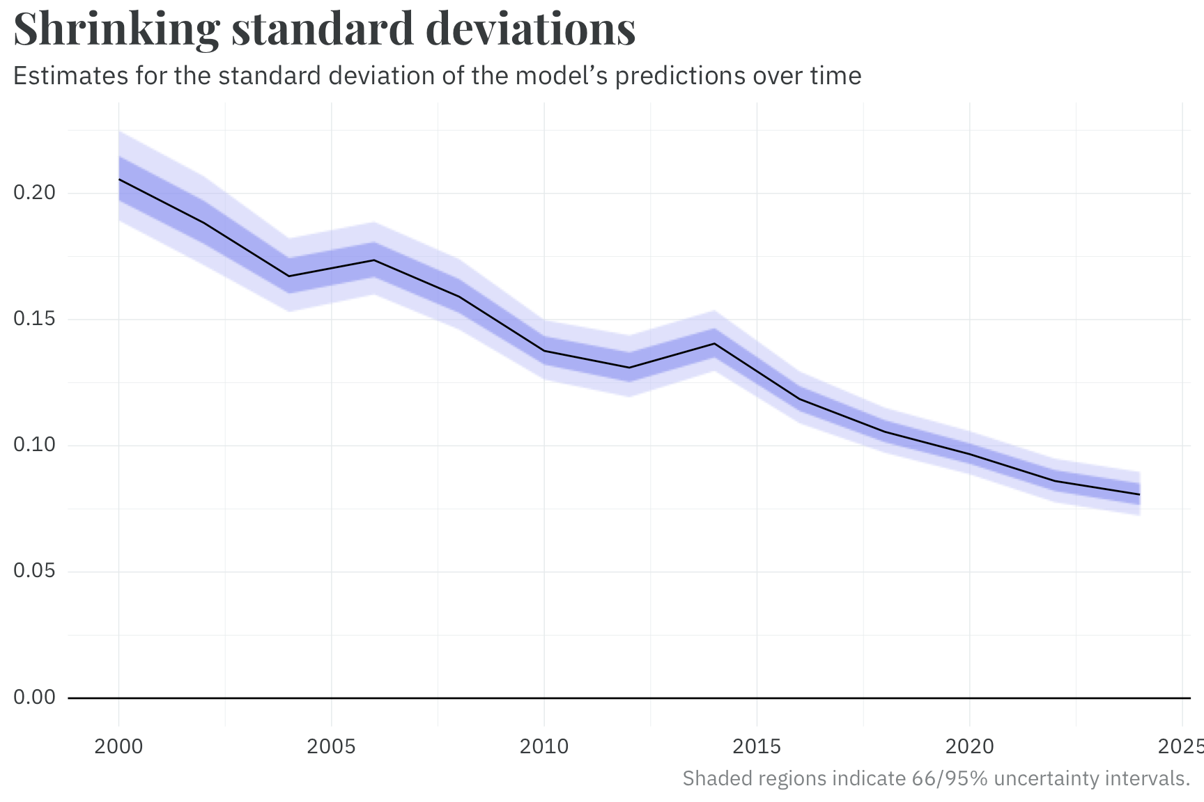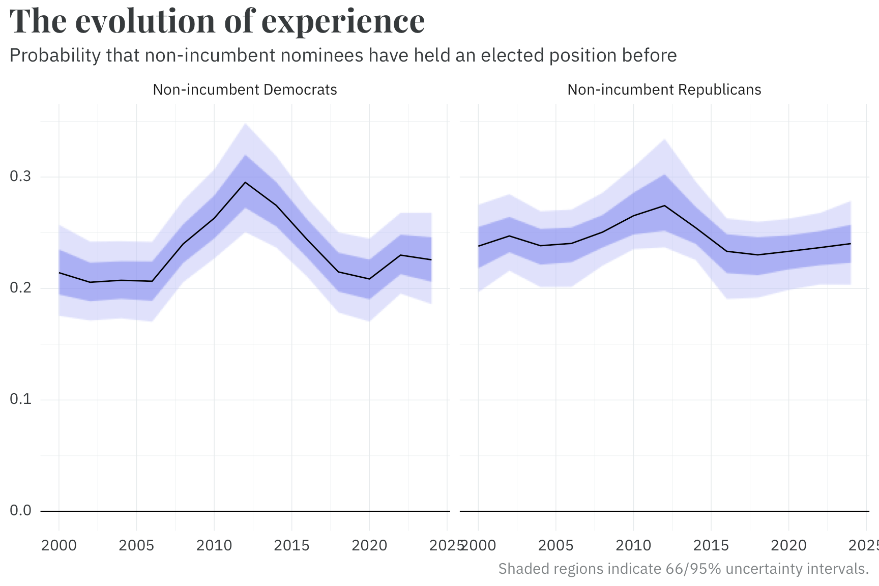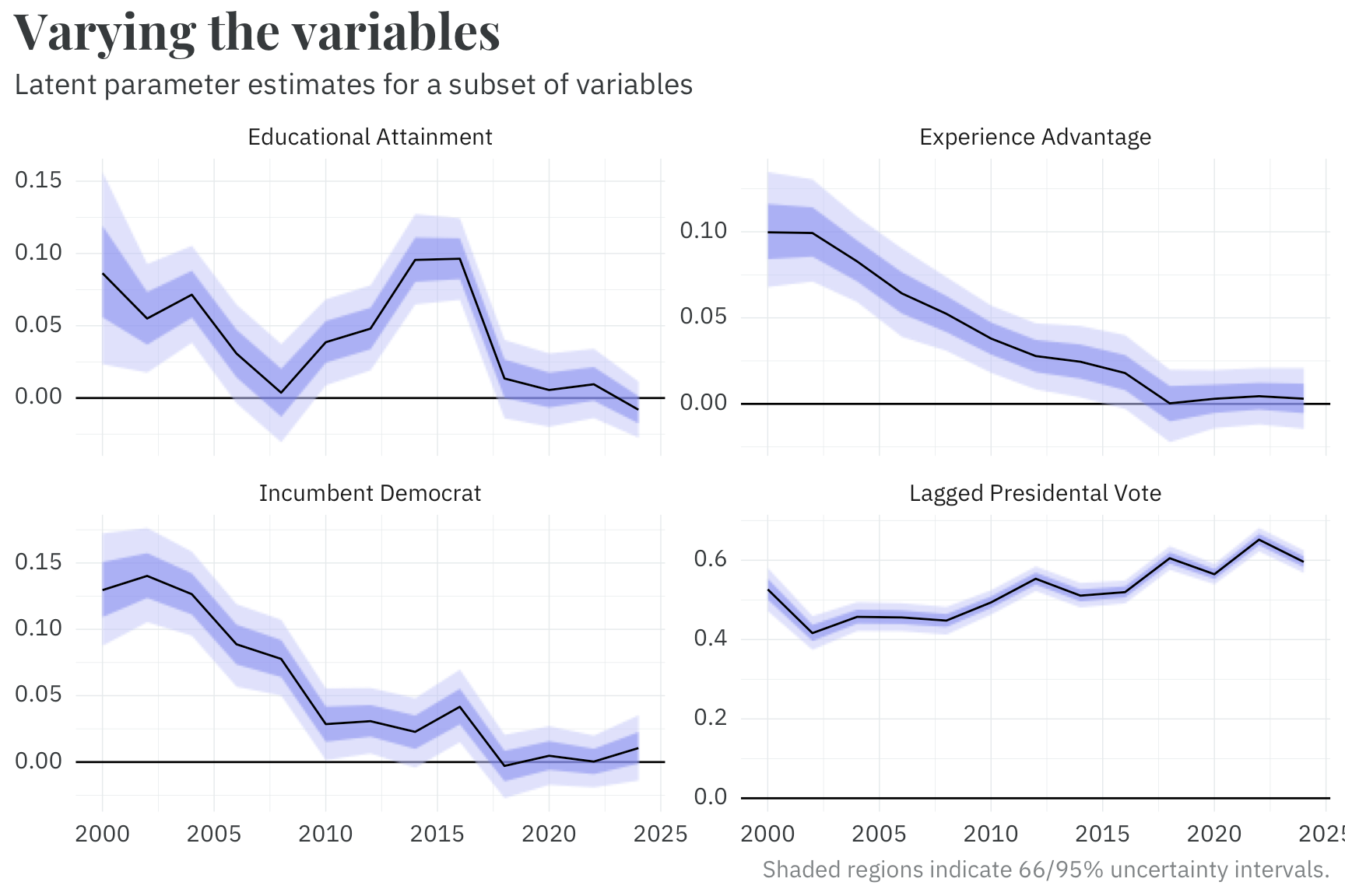 In this case though I agree that trying to estimate time-varying candidate skill would introduce identifiability headaches. Even if you parameterized it in a way that made them technically identifiable, it would probably have to be largely through the prior, which is not what you want to be doing.