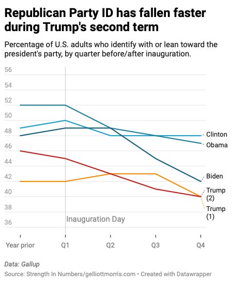 Trump’s 12-point decline in party ID margin (a 6-point decrease in share GOP) since Q4 2024 is 3x the decline in his first term.