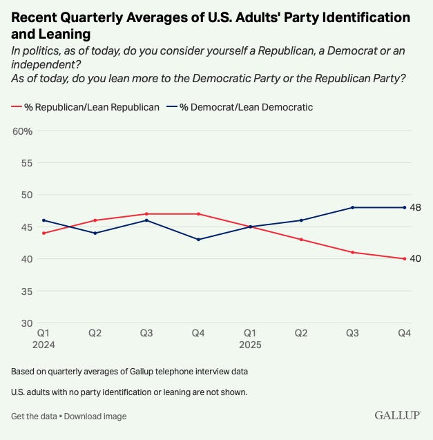 In Trump’s second term, however, the Republican Party is shedding members at a much higher pace. Gallup released its latest party identification data this week, and the numbers show Republican identification dropped from 46% in 2024 to just 40% in Q4 of 2025 — a 6-point decline, triple the 2-point drop during Trump’s first term.