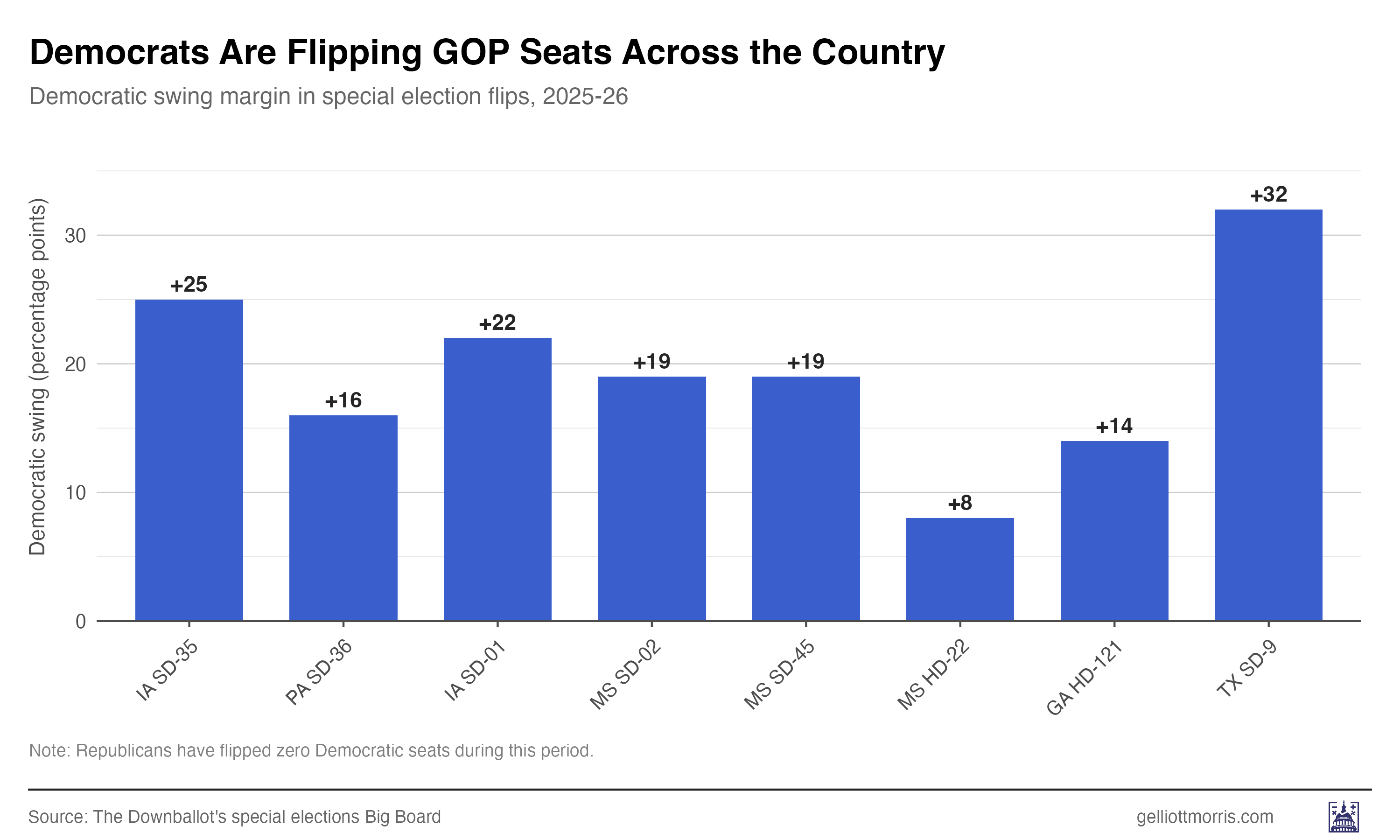 Since Trump took office, Democrats have flipped eight Republican-held state legislative seats in special elections across five states. Republicans have flipped zero Democratic seats.