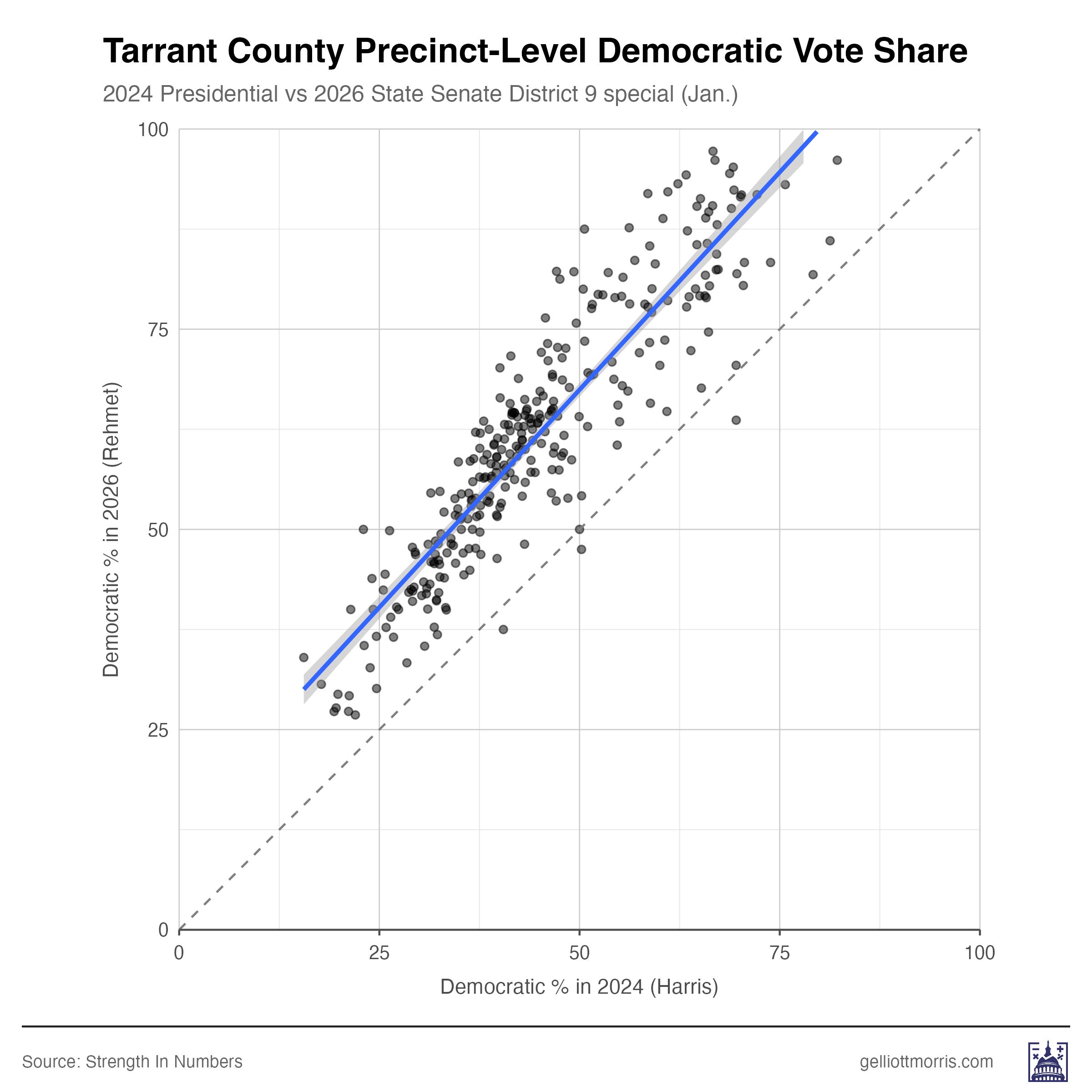 Looking at precinct-level (technically “vote centers” in Tarrant County) data from TX-SD-9, Rehmet outperformed Kamala Harris’s 2024 numbers nearly everywhere — with pretty uniform gains across the map.