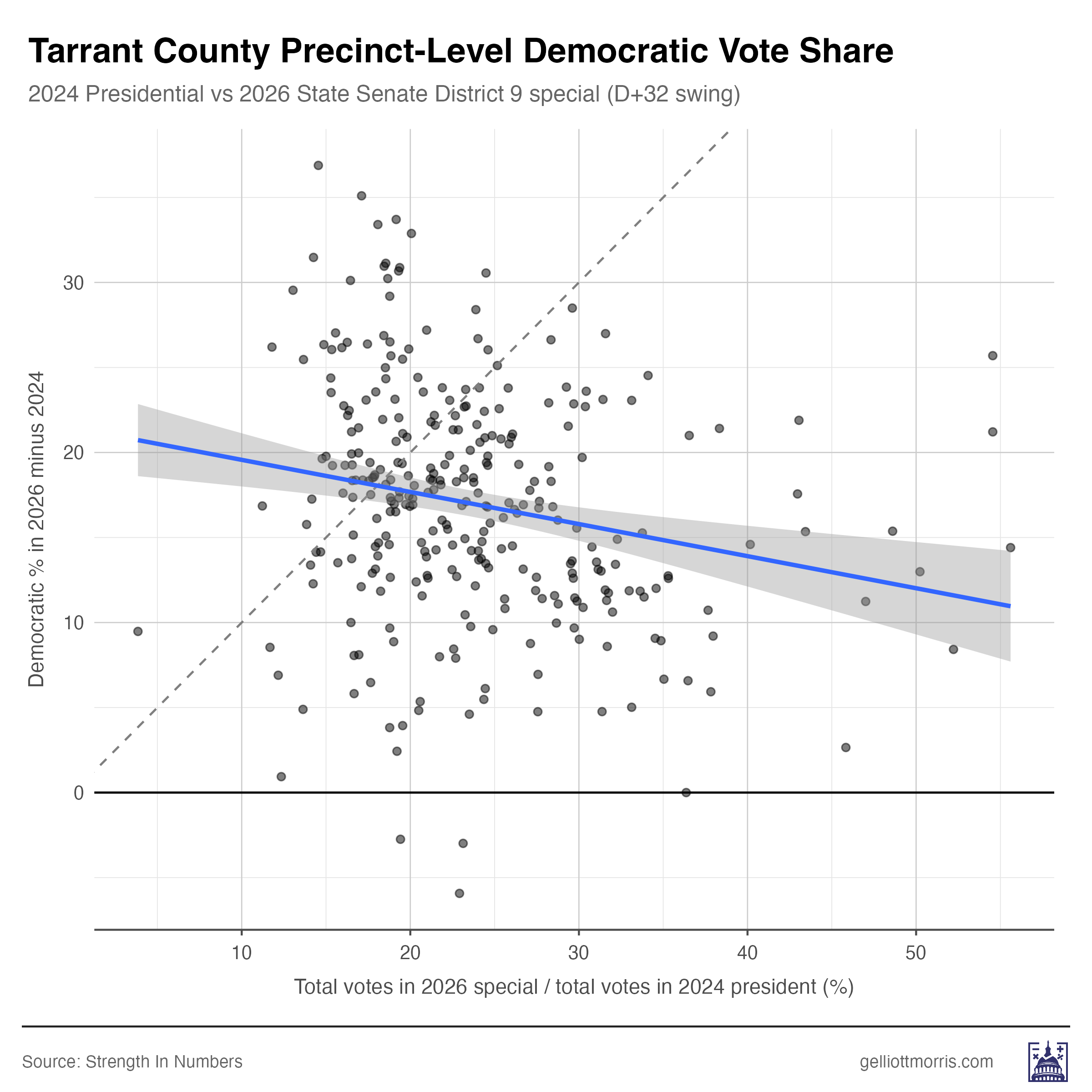 If you’re more of a map person, here is 2024 POTUS in all of Tarrant County vs the 2026 Senate special (just SD-9 precincts):