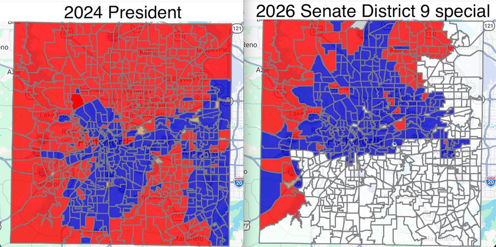Democratic candidate Taylor Rehmet has won a special election for Texas State Senate District 9 in Tarrant County — a seat Donald Trump carried by 17 points in November 2024, per The Downballot. As I’m writing this, approximately 99% of the vote has been counted, and Rehmet carried the seat 57.2% vs his Republican challenger, Leigh Wambsganss, at 42.8%. That’s a 14.4-point margin, and a 31.4-point swing vs Harris’s margin in 2024 (if you ignore votes for minor-party candidates, the swing rounds up to D+32).