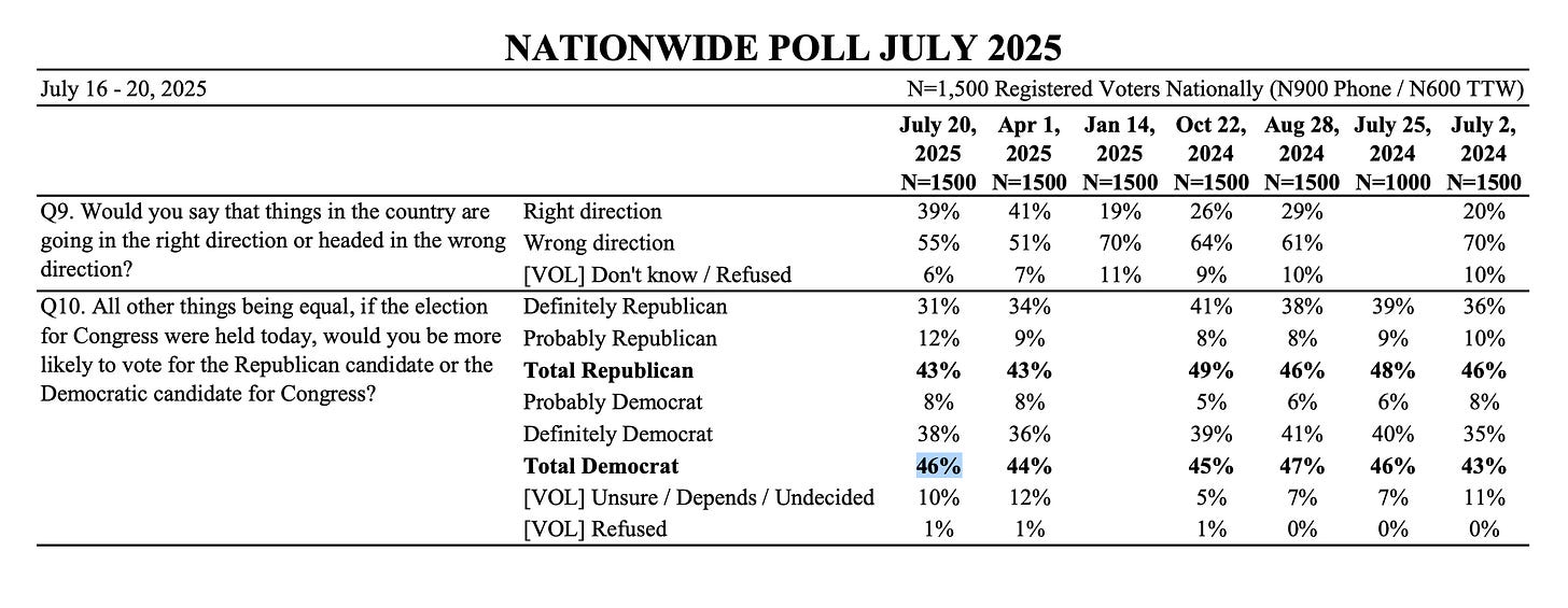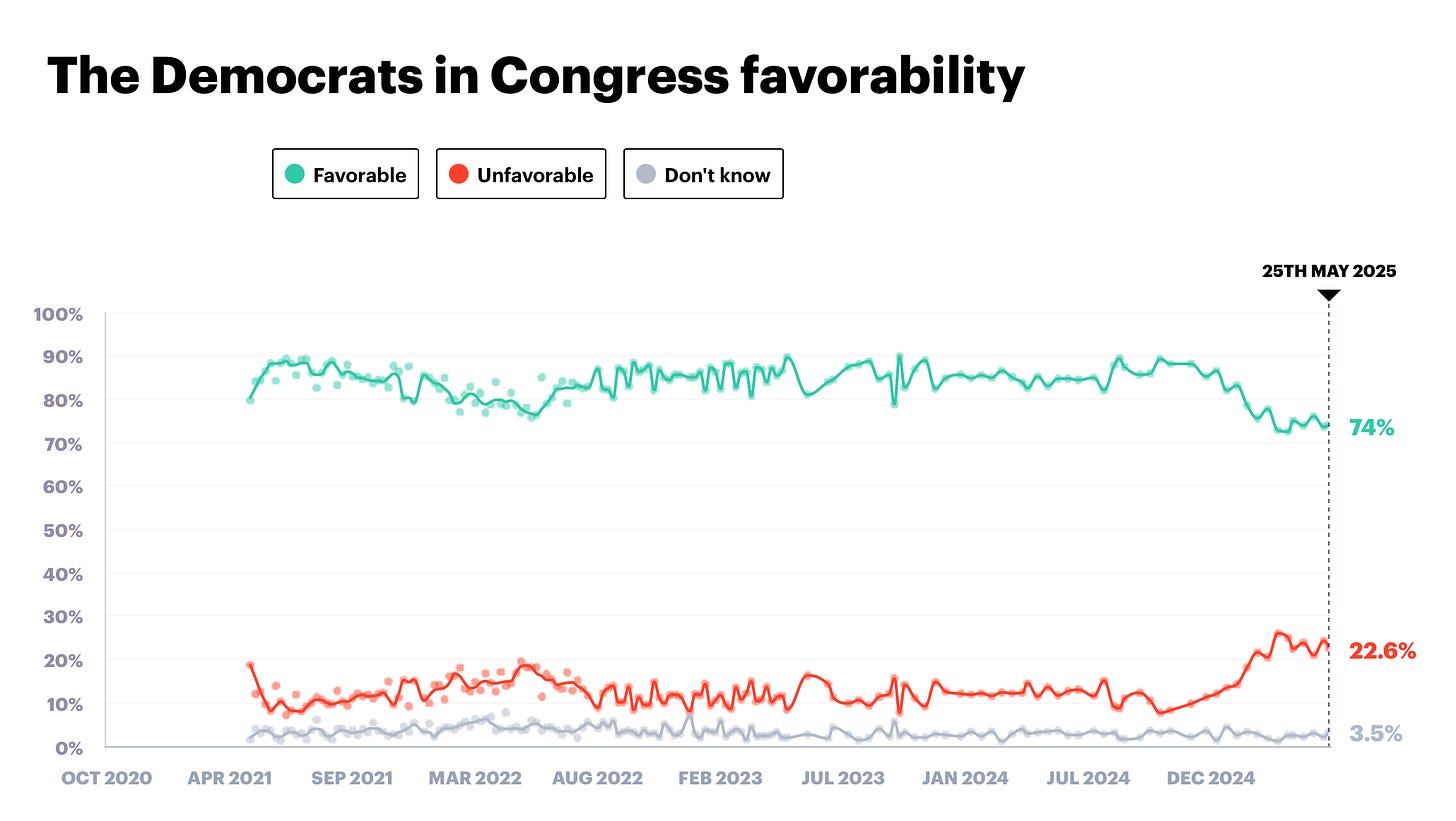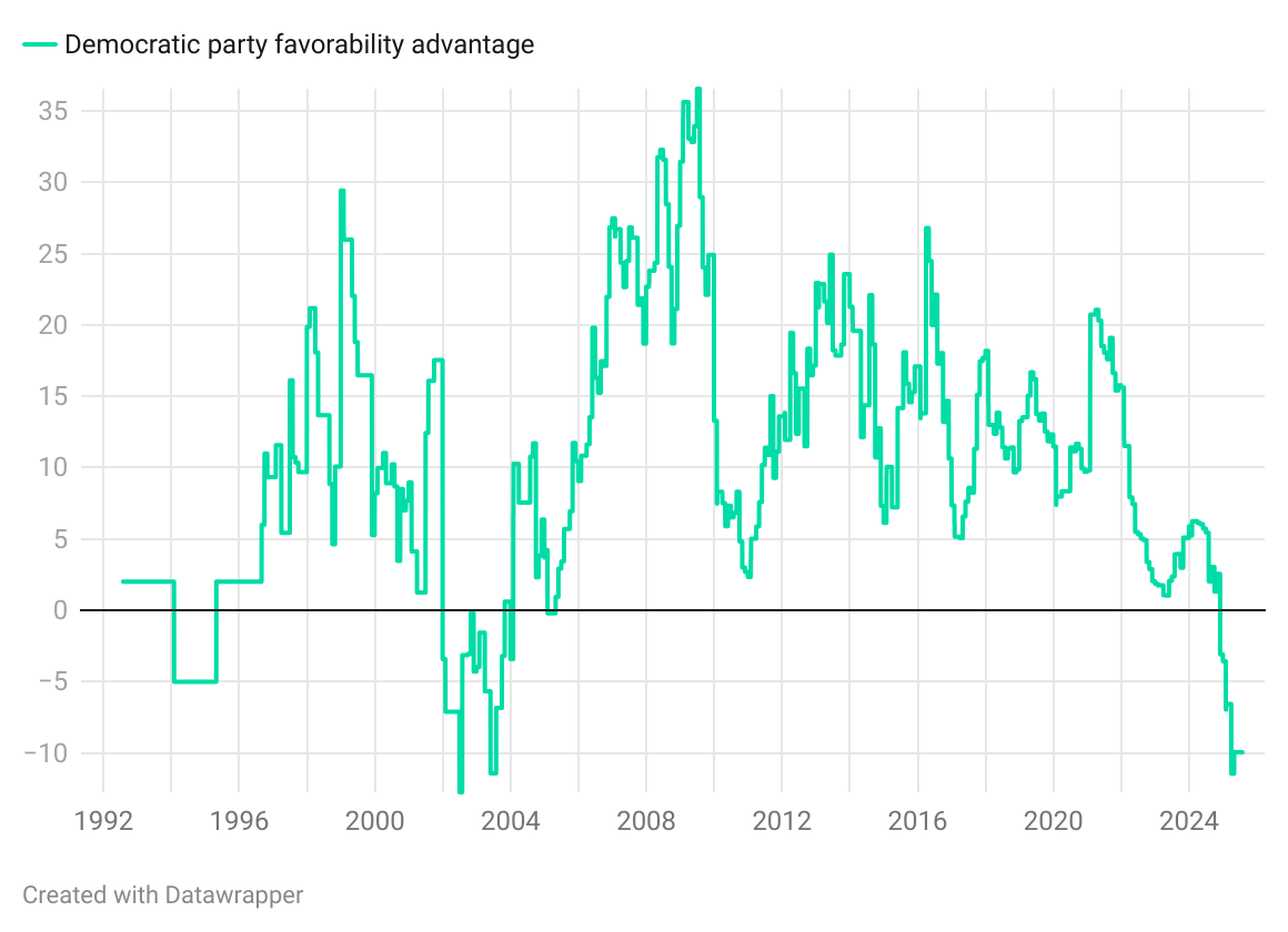 The WSJ reports that Democrats are 19 points underwater in party image compared to Republicans. That's indeed pretty bad. But does it mean, e.g., that voters won't vote for Democrats in next year's elections? In fact, no! The very same Wall Street Journal poll that got branded as the party having its "worst ever" image also shows the Democrats up three in the generic congressional ballot. That’s a six-point swing from their last poll in 2024 and would be large enough for the Democrats to win somewhere around 230-235 seats in the U.S. House of Representatives.