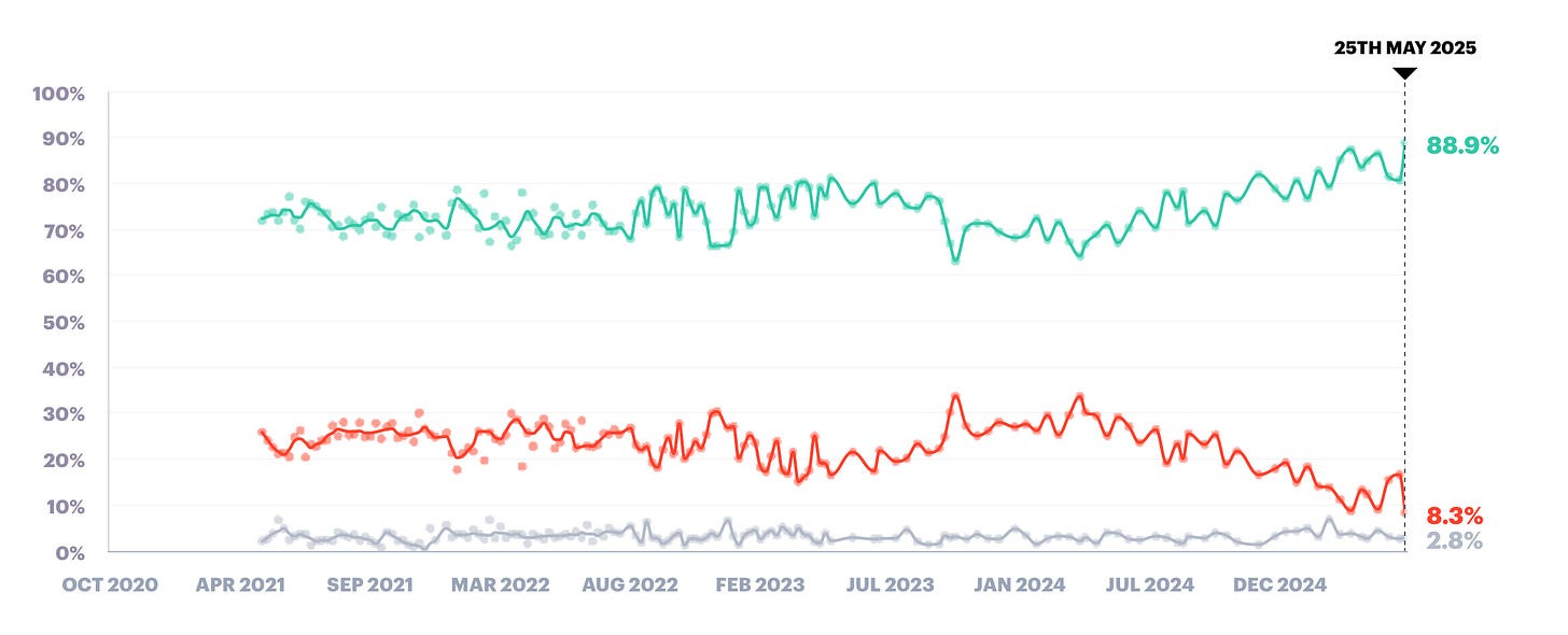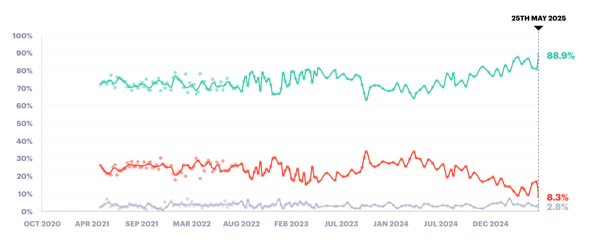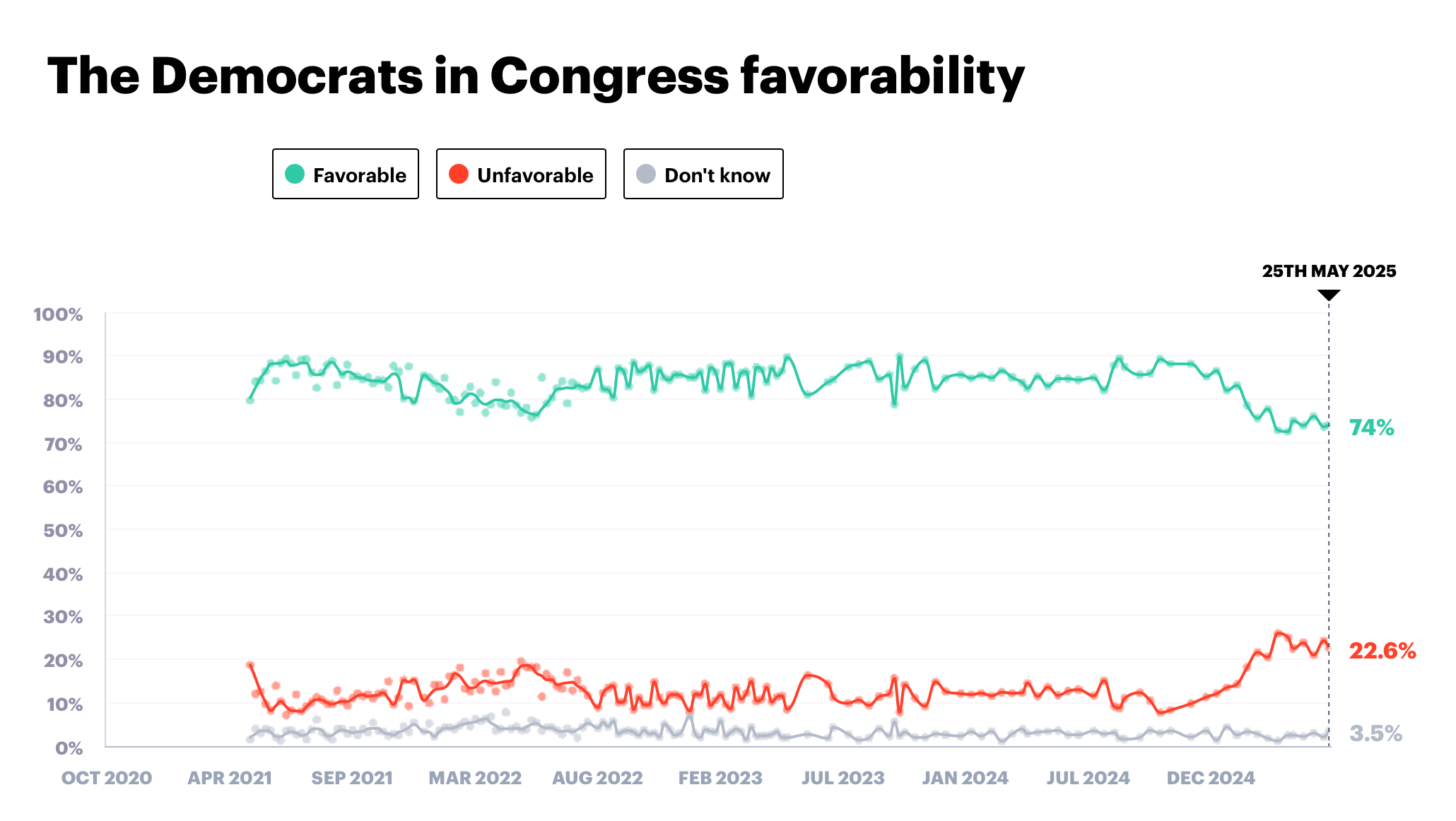The WSJ reports that Democrats are 19 points underwater in party image compared to Republicans. That's indeed pretty bad. But does it mean, e.g., that voters won't vote for Democrats in next year's elections? In fact, no! The very same Wall Street Journal poll that got branded as the party having its "worst ever" image also shows the Democrats up three in the generic congressional ballot. That’s a six-point swing from their last poll in 2024 and would be large enough for the Democrats to win somewhere around 230-235 seats in the U.S. House of Representatives.