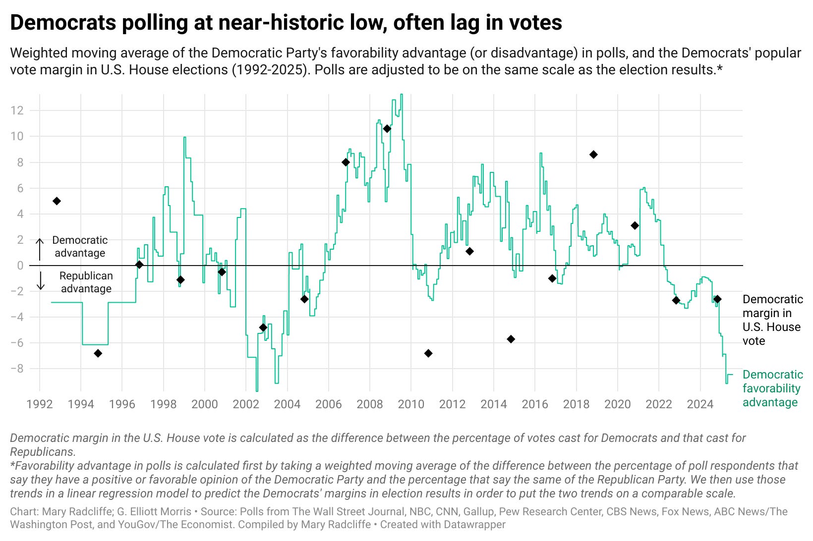In case you don't read image captions: Note that we did rescale the net favorability trend to get the y-axis to match the scale of U.S. election results. The Democrats go from being 10 points less popular than the Republicans to having a predicted 8-point loss in the popular vote IF the 2026 election were held today.