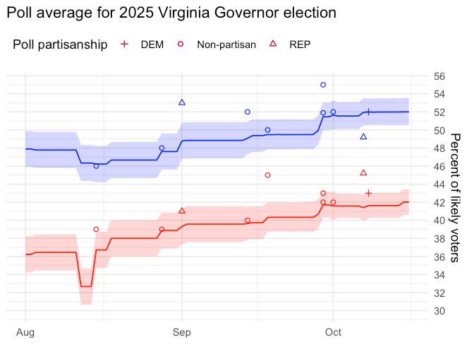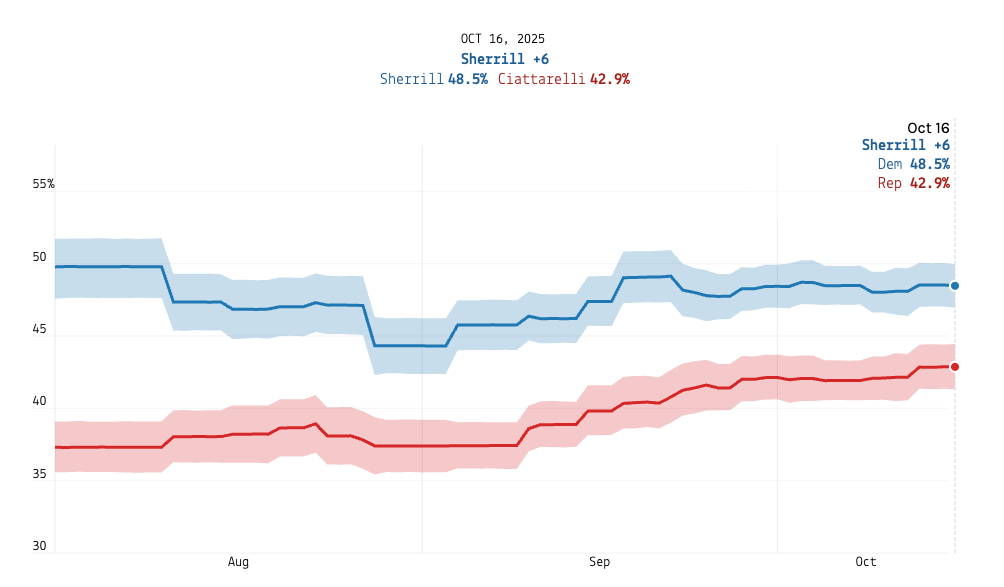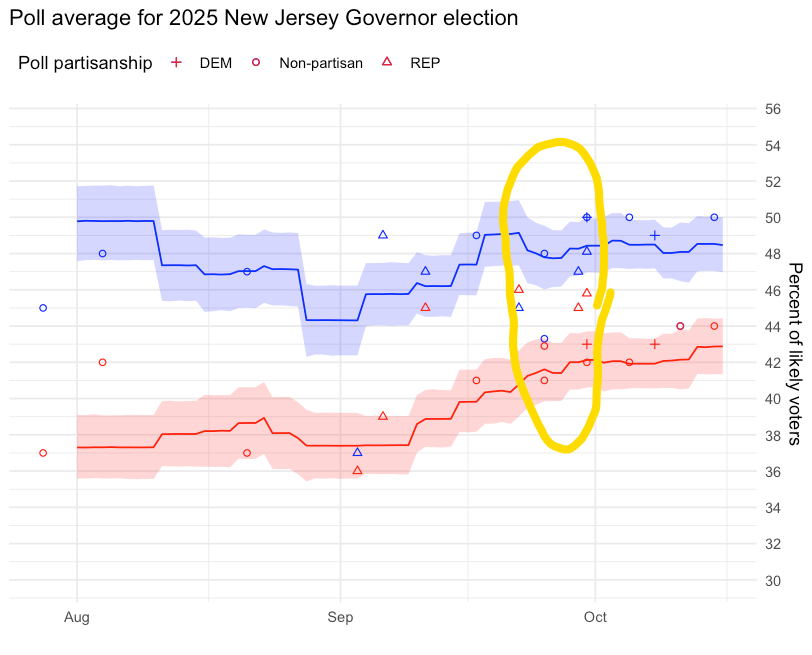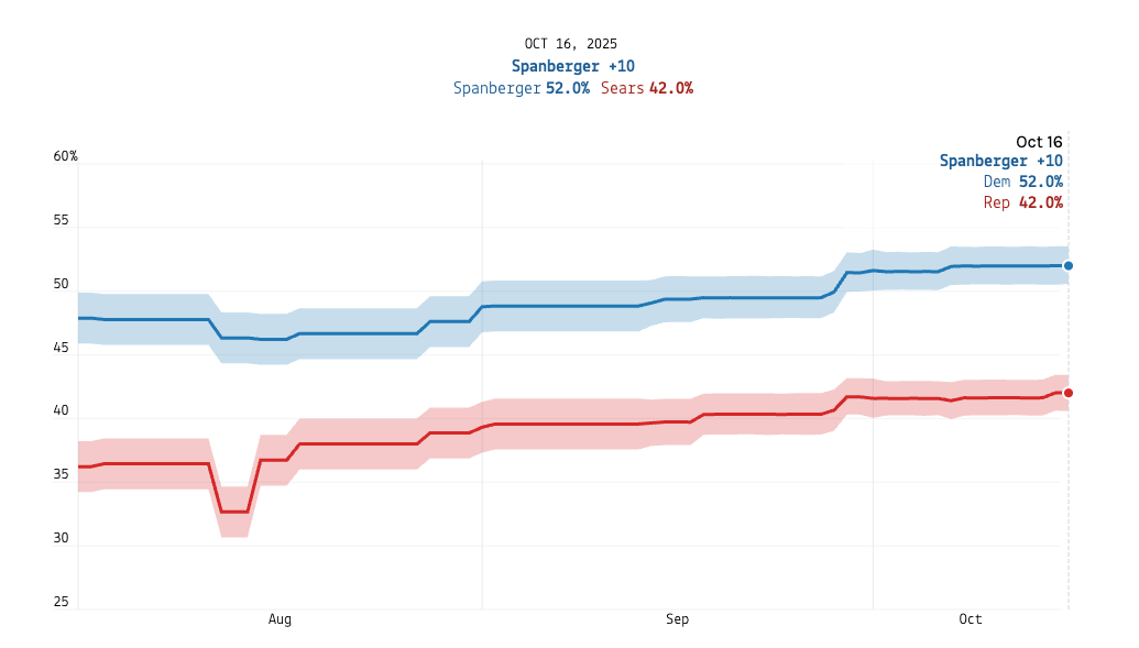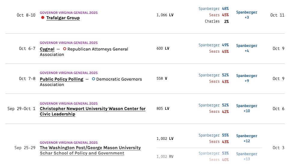 Fascinating analysis, but what's is the sample size and margin of error? Even a ten point spread can be an illusion if the margin of error is +/- 5 points. I'm sure the polls showing a 3 point advantage for the Dem in VA are within the margin. I think one of the reason people are suspicious of polls is that they mistake specific numbers for ranges. Thanks.