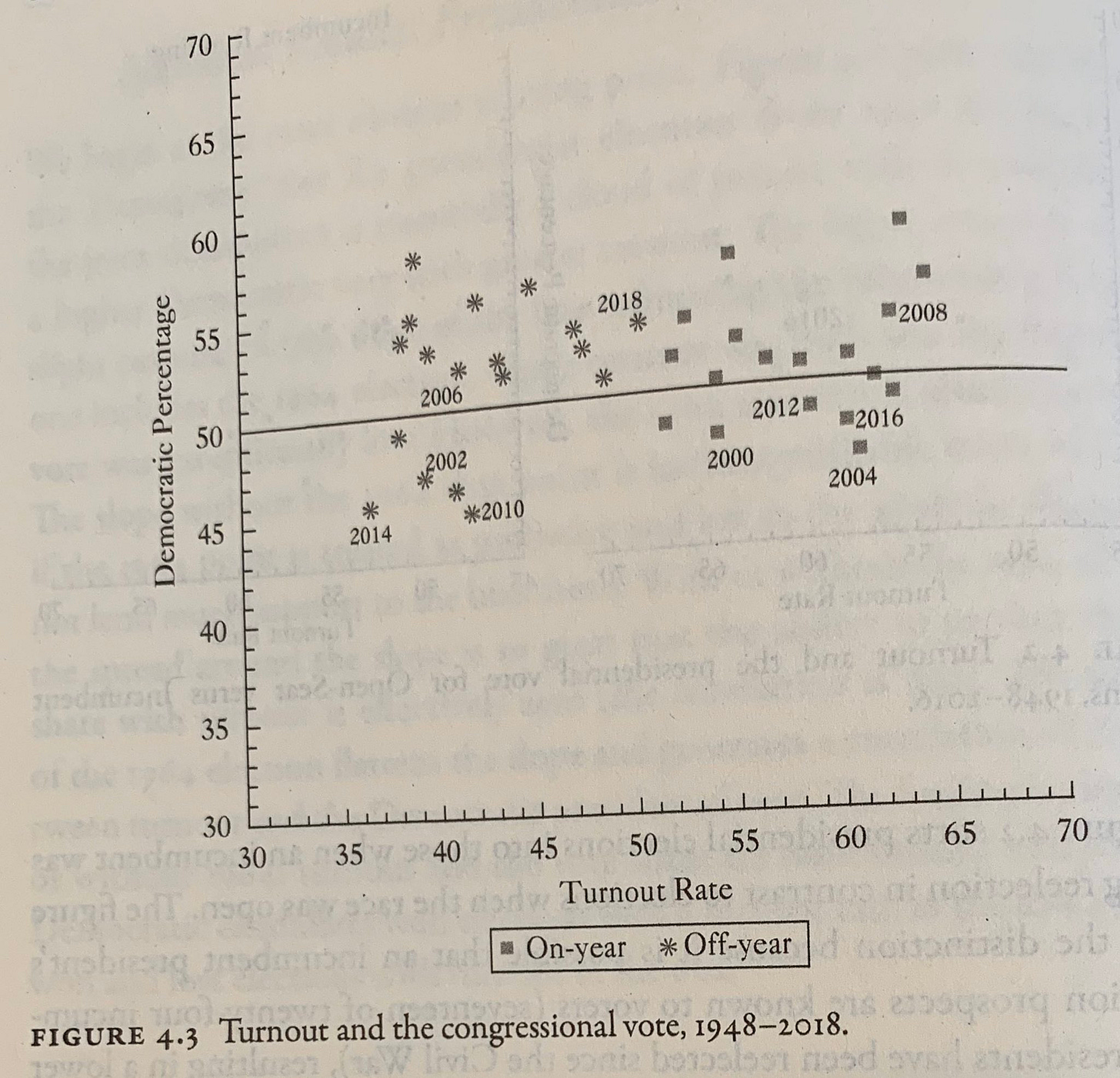On Twitter this week Matt Grossman linked to a new book called “The Turnout Myth” in which the authors political scientists Daron Shaw (a former professor of mine) and John Petrocik suggest that the usual claim that higher turnout benefits Democrats is wrong. Grossman tweeted out the following graph as a central finding of the book. In congressional elections with higher turnout, it shows, Democrats have not tended to out-perform other elections with lower turnout.