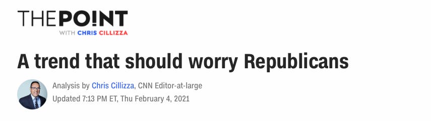 I imagine these psychological pressures are part of the reason why so many news outlets are publishing rather apocalyptic takes about a recent decrease in Republican Party registration around the country. Across the country, tens of thousands of registered GOP voters have switched their affiliation to Democratic or a member of a third-party. From the 30,000-foot DC perspective, these numbers apparently constitute an "exodus" of Republicans from their party, a trend that should "worry" them.
