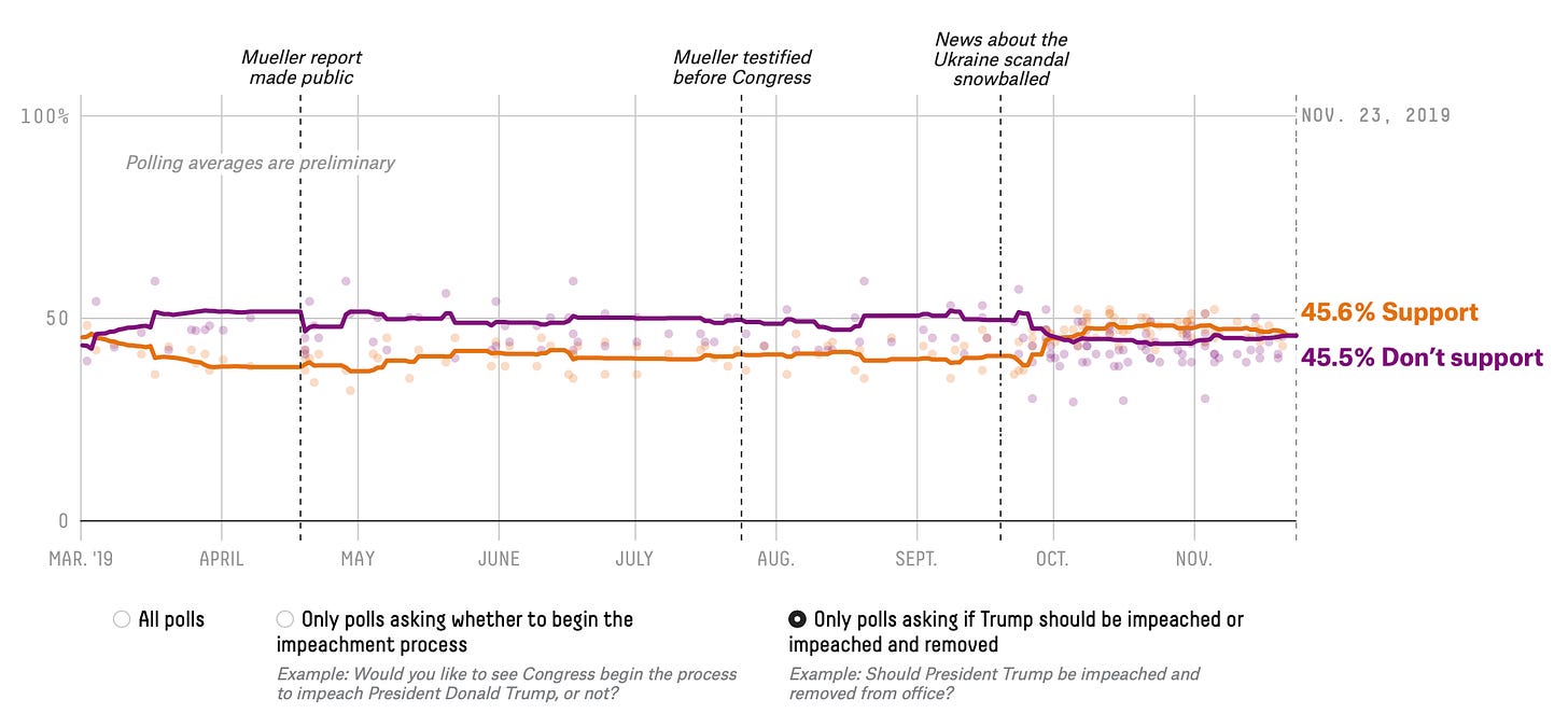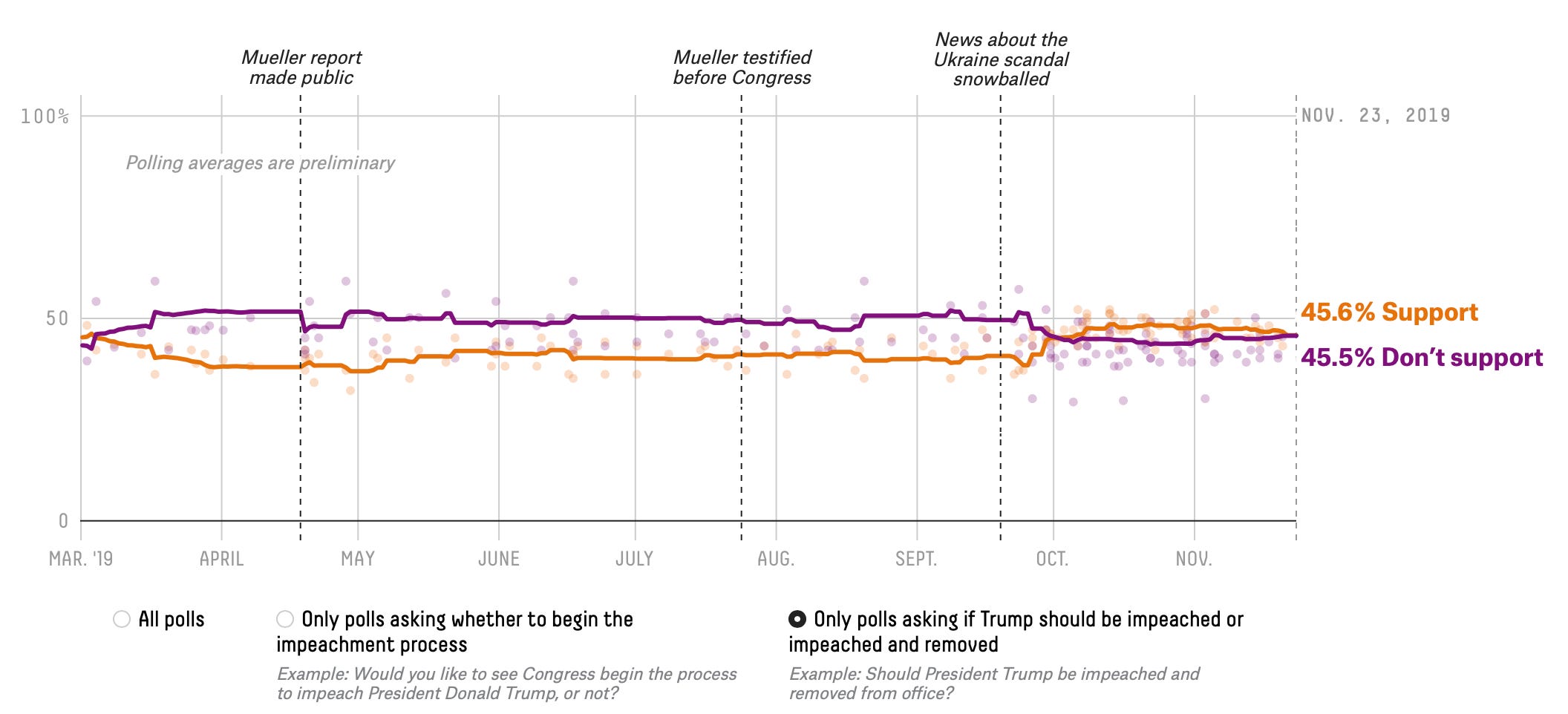 But among the public, it actually looks like support for impeaching President Trump (and removing from office) has decreased over the past two weeks. The share of voters who favor impeachment has fallen to 46% from a high of 49-50% a month ago, according to FiveThirtyEight’s averaging.