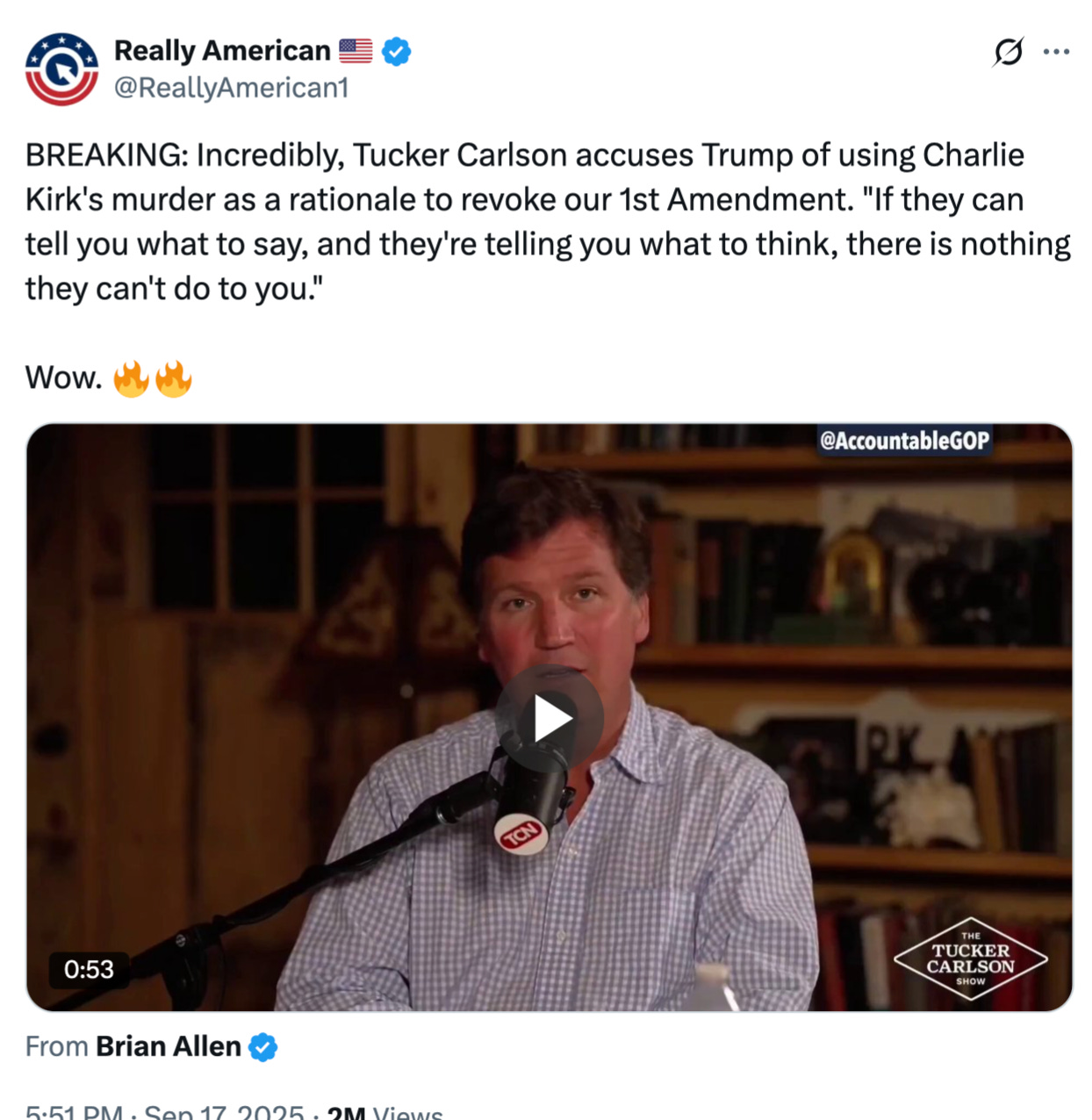 And there are new calls to #cancel people from their jobs based on what they post on social media. Texas Governor Greg Abbott is even pursuing action against hundreds of teachers who (allegedly) posted “inappropriate” messages about Kirk’s death. And AG Pam Bondi has said she wants to criminalize what she is calling partisan “hate speech” — which is, of course, protected by the First Amendment (it’s kinda the whole reason to have it):