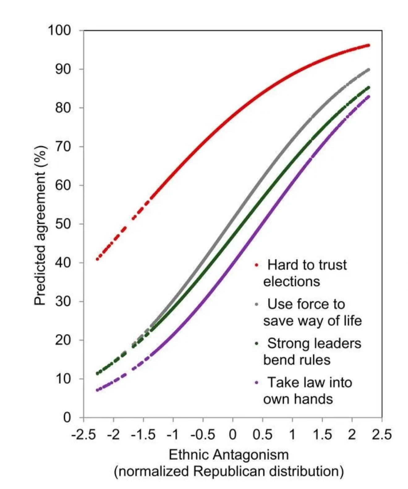 By 2020, political scientists started calling these people “ethnically antagonist,” and showed they held views on a range of liberal values that were incompatible with democracy. The ethnic antagonists were more likely to agree with statements such as “strong leaders sometimes have to bend the rules to get things done” and “the traditional American way of life is disappearing so fast that we may have to use force to save it,” for example: